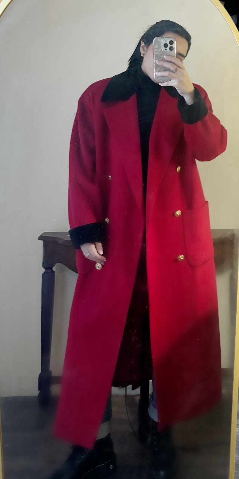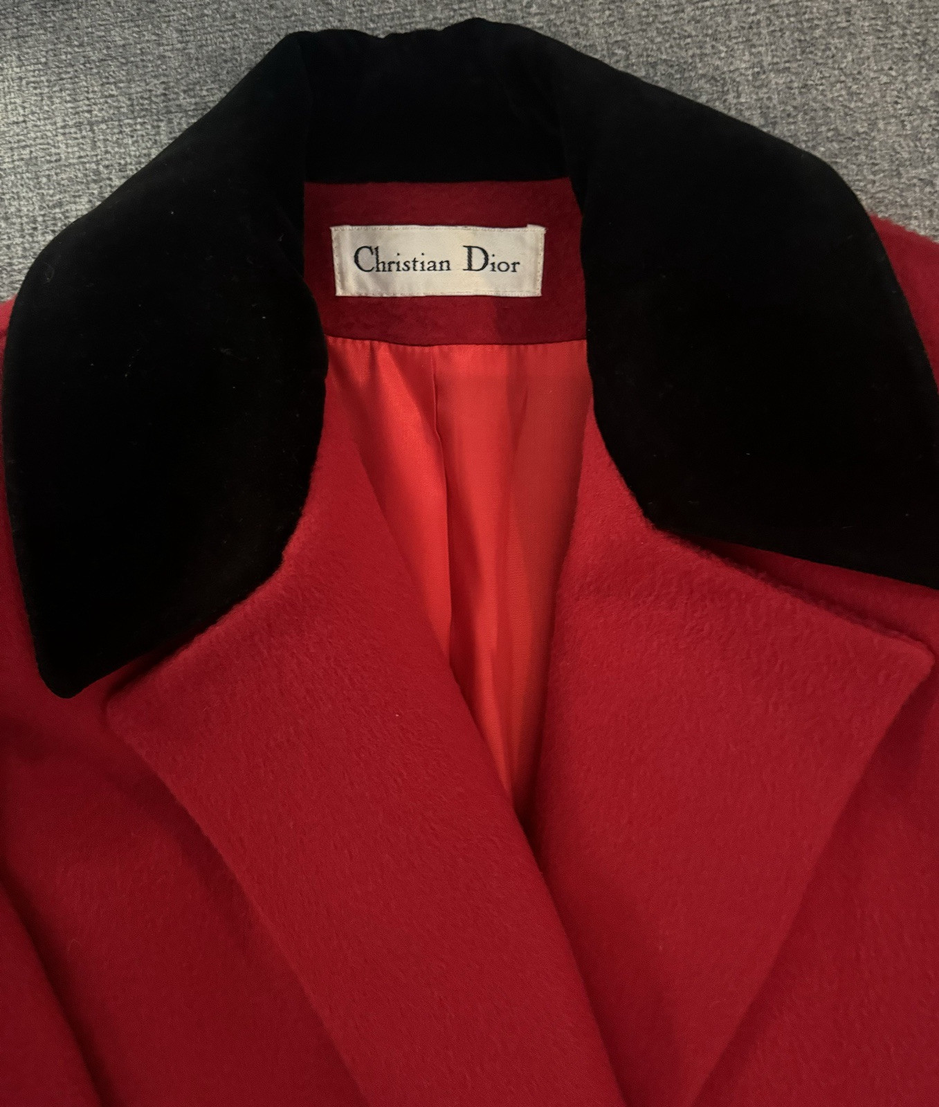 Make a bold statement with this stunning vintage Christian Dior wool coat. Featuring a rich red hue, luxurious black velvet collar & cuffs, and gold-tone double-breasted buttons, this elegant piece exudes timeless sophistication. Perfect for fall and winter, this structured yet comfortable coat is a collector’s dream. ✔ 100% Wool Outer, Fully Lined – High-quality craftsmanship ✔ Classic Double-Breasted Design – Gold buttons add elegance ✔ Black Velvet Collar & Cuffs – A luxurious vintage touch ✔ Warm & Stylish – Perfect for cold weather 📏 Measurements (Flat Lay): • Armpit to Armpit: 21.5” • Shoulder to Shoulder: 21.5” • Hips: 22” • Length (from Shoulder): 49.5” 📌 Size: 8 (Check measurements for fit) 📌 Condition: Excellent vintage condition with a small fabric imperfection near the shoulder (as shown in the last photo), barely noticeable when worn. 📌 Dry Cleaning: The coat will be professionally dry-cleaned before shipping for a fresh, ready-to-wear experience.