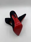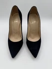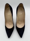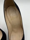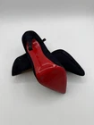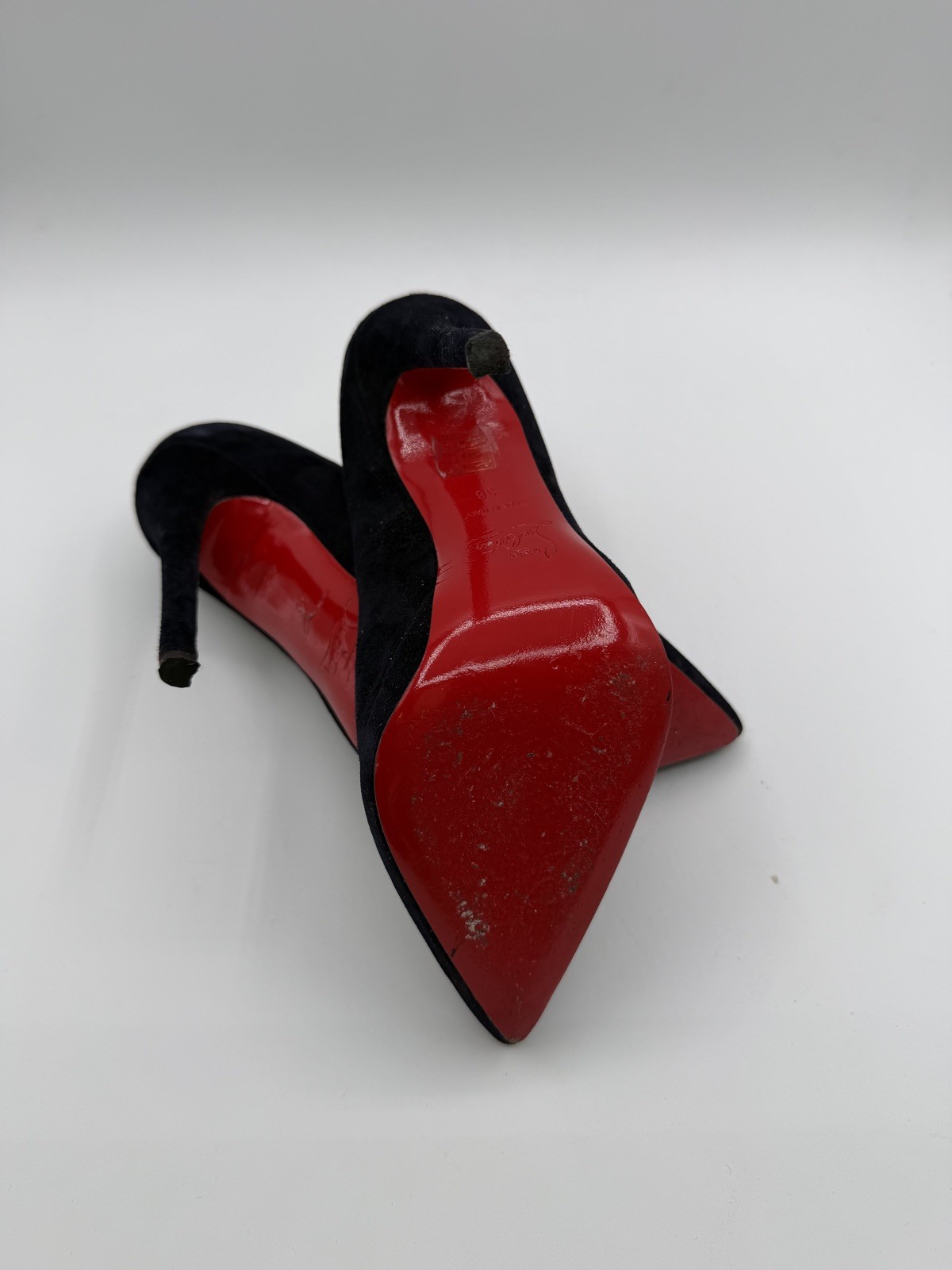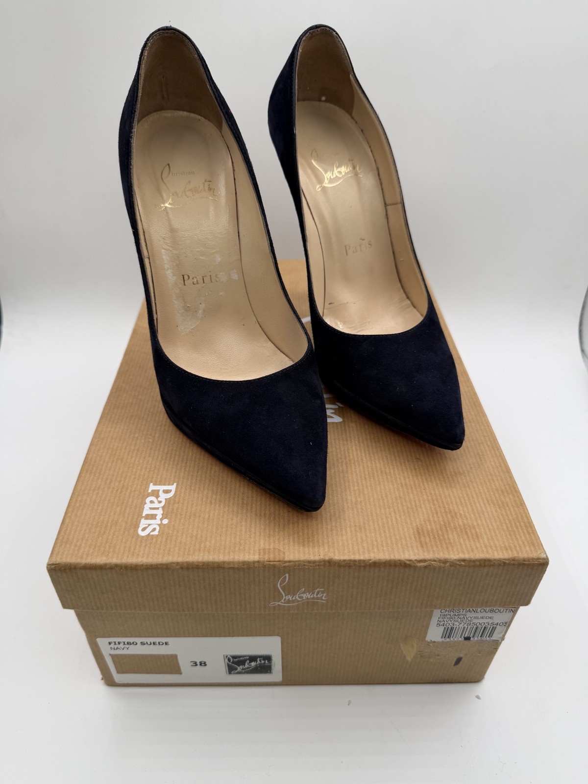 The Christian Louboutin Fifi 80 Navy Suede heels in size EU 38 are a stylish and versatile choice for various occasions. These pointed toe pumps feature a high stiletto heel accented with gold detailing, a signature red sole, and the designer's logo. Made with leather outsole and lining, these heels are perfect for formal events, parties, weddings, or even a night out in the city. The navy color adds a touch of sophistication to any outfit, making them a must-have for any fashion-forward woman's wardrobe. Excellent condition in box, hardly worn, little signs of wear See pictures for details.