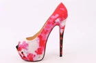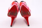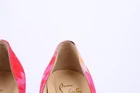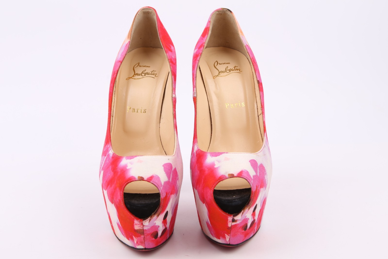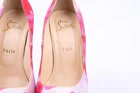 Color: Pink, White, Brown, and Purple Exterior: The fabric is clean. Interior: The heel fabric has minor discoloration and wear. There is minor discoloration near the toe area. Soles: The soles show heavy wear as pictured.