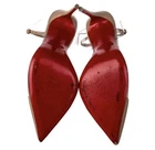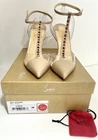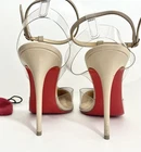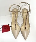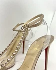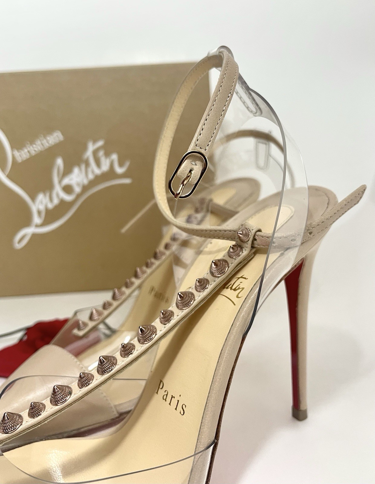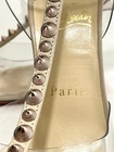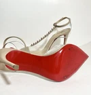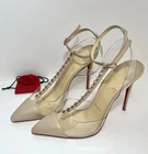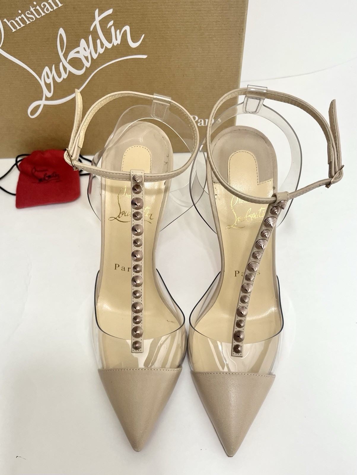 Authentic Pre owned condition (please see pictures) •Minor discoloration throughout; minor fading throughout; minor residue throughout; minor scuffs throughout; minor misshapen at strap; wear at soles Description • Christian Louboutin Leather T-Strap Pumps • Neutrals • PVC Trim • Pointed-Toes with Studded Accents • Straps & Buckle Closure at Ankles •Heels: 4" Includes original box and small empty red bag for heels caps ( please see picture)