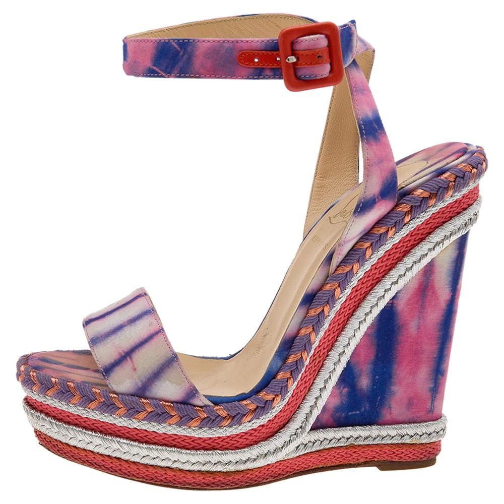Our eBay Store About Us Contact Us Add to Favorite Sellers Christian Louboutin Multicolor TieDye Fabric Duplice Platform Wedge Sandals These sandals from the House of Christian Louboutin are pretty and poised. Made from multicolored fabric, these sandals flaunt platform wedge heels and an ankle strap feature. They are provided with buckled closure and red soles. Complement your summer dresses by wearing these sandals. Product Details Brand Christian Louboutin Color Multicolor Includes The Luxury Closet Packaging Size 37 Outsole Length 20 cm Outsole Width 7 cm Certified by The Luxury Closet This item has gone through a detailed authentication process overseen by our experts. We offer a lifetime guarantee of authenticity on all our items. How We Check The in-house team of experts at The Luxury Closet is highly trained to verify the authenticity and the condition of the luxury products. They ensure that only 100% authentic items are put on sale.The evaluation process is unique with its own mix of assessment criteria and differs according to the category. Each item is evaluated based on the following combination of hallmarks, hardware, stitching, symmetry, material, craftsmanship, stamping, codes, hologram stickers, and packaging. Our authenticators also check if the items have been modified or amended (e.g., aftermarket diamonds, replaced batteries, repaired bags, etc.) International Buyers Import duties, taxes and charges are not included in the item price. These charges are the buyers responsibility. Please check with your country’s customs office to determine what these additional cost will be prior to buying.