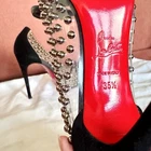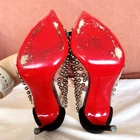 -slip-on point toe pumps with black patent leather cap toes tipped with black leather bows, black suede heels, clear PVC upper studded with polished gunmetal silver pearls, and iconic red bottoms -size EU 35.5 // US 5.5 -great condition; worn 2-3 times- general wear on the bottoms -~4.5” stiletto heel -upper material: PVC, suede, leather, & patent leather -lining material: PVC -insole & sole material: leather -hardware: gunmetal silver -origin: Italy -comes with extra heel tips and pearl studs in cute little red baggies :)