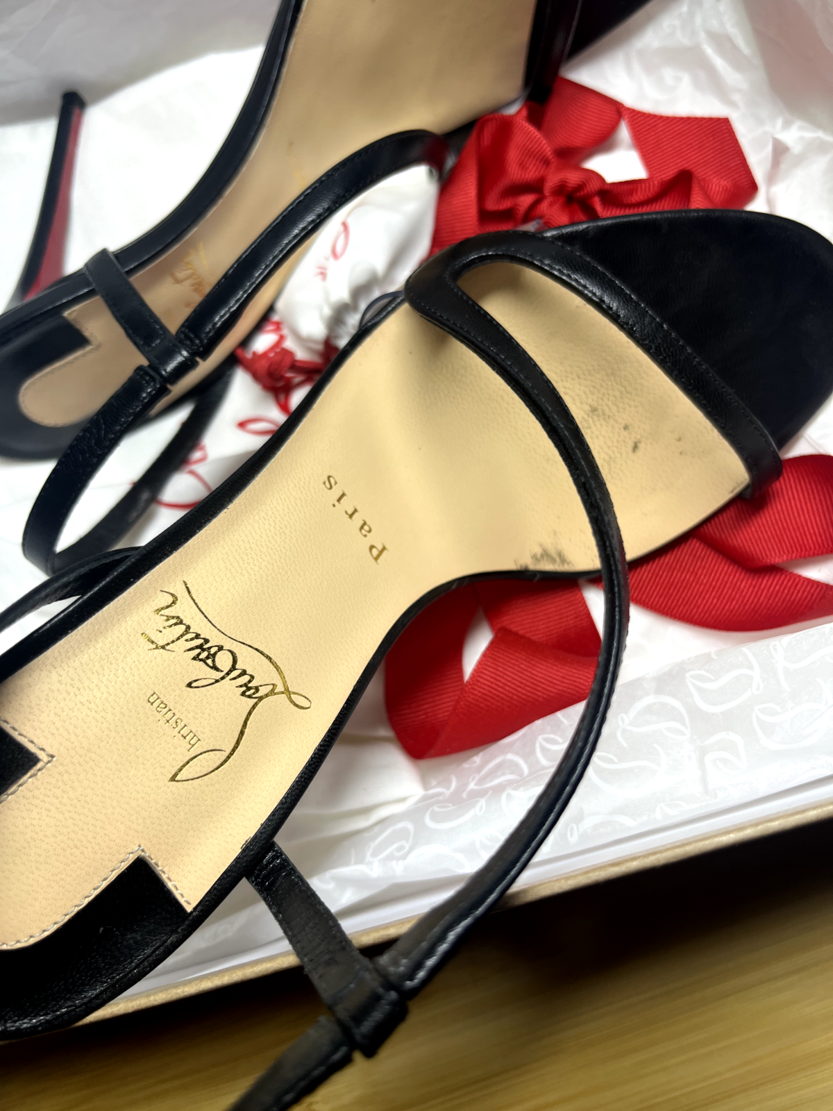Christian Louboutin Rosalie black leather strappy heeled sandals , crafted with the brand’s signature elegance and timeless design. These heels have been used and are in good condition , showing light, normal wear consistent with use. They come with the original box and extra heel tips , making them a great find for a Louboutin lover or collector. Perfect for dressy occasions, evenings out, or elevating a classic outfit with iconic style. Brand: Christian Louboutin Style: Rosalie Color: Black Material: Leather Condition: Used – Good Includes: Original box and extra heel tips