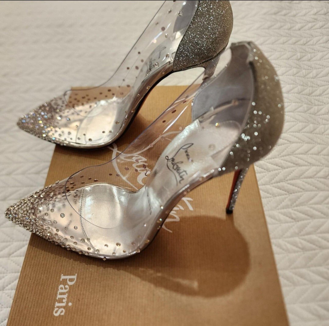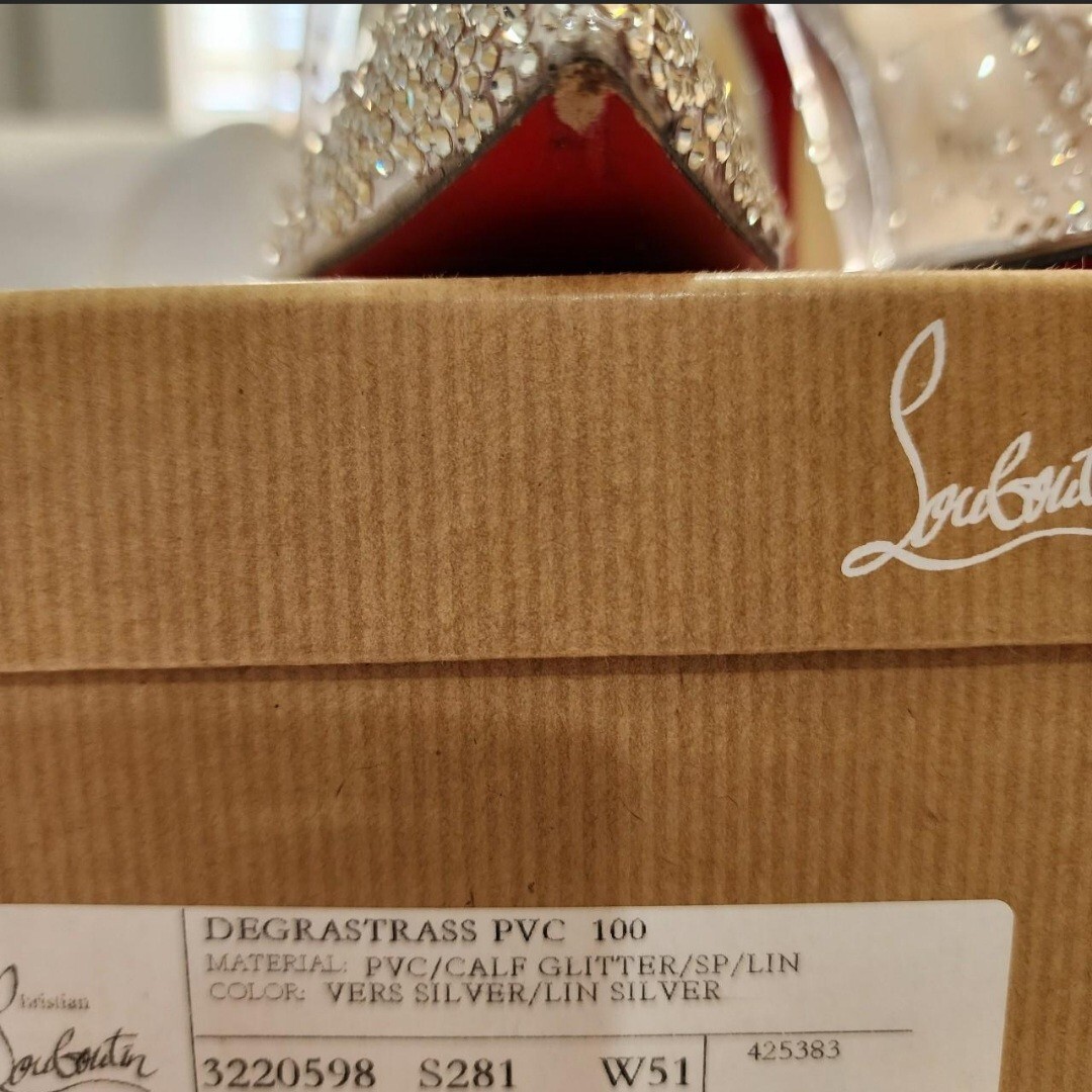 Luxury Alert: Christian Louboutin Degrastrass! Hey, shoe lovers! Get ready to elevate your shoe game with these STUNNING Christian Louboutin Degrastrass PVC high heels! Size 38, these 100mm stilettos feature a dazzling crystal gradient set in transparent PVC, finished with a silver glittery calf leather heel. Worn only once, these shoes have some light scuffing (as shown in photos), but that doesn't detract from their glamour and sophistication. Perfect for making a statement at a formal event or party, these shoes are sure to turn heads! Details: - Brand: Christian Louboutin - Style: Degrastrass - Size: 38 - Material: PVC, silver glittery calf leather - Heel height: 100mm - Condition: Pre-owned, light scuffing - RRP: $1865 AUD Price includes insured delivery and signature required upon collection. #ChristianLouboutin #Degrastrass #LuxuryShoes #PVCHeels #SilverGlitter