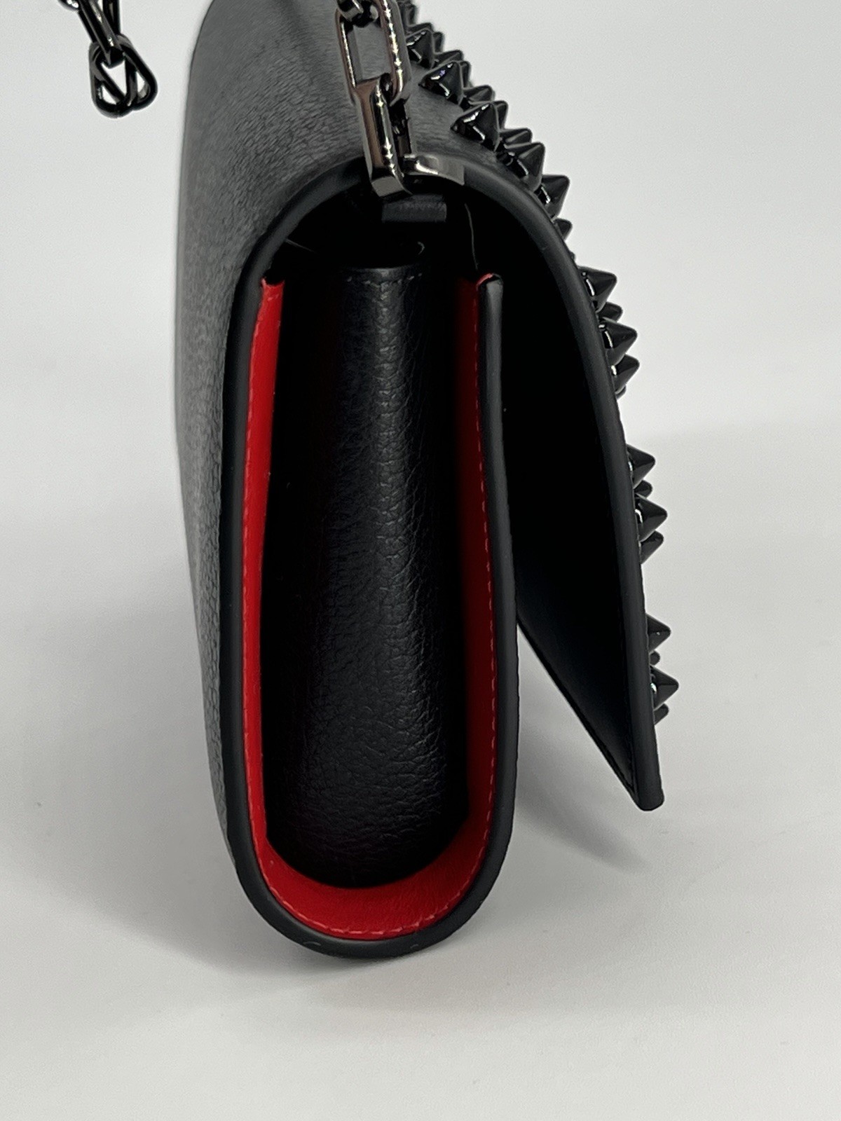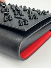 The Christian Louboutin Paloma Studded Leather Wallet-On-Chain Bag is a stylish and versatile accessory for women. This rectangular-shaped bag features a magnetic closure and a black studded accent, adding a touch of edginess to any outfit. The black leather exterior with red leather lining exudes luxury, while the small size makes it perfect for various occasions including weddings, parties, casual outings, formal events, and business meetings. The bag also comes with original dust bag and box, making it a must-have for any fashion-forward individual looking for a statement piece. Made in France, this Christian Louboutin Paloma model is a chic addition to any wardrobe. New. Comes with box and dust bag.