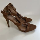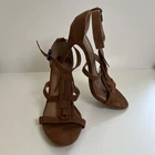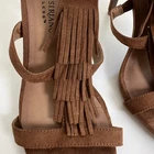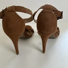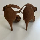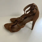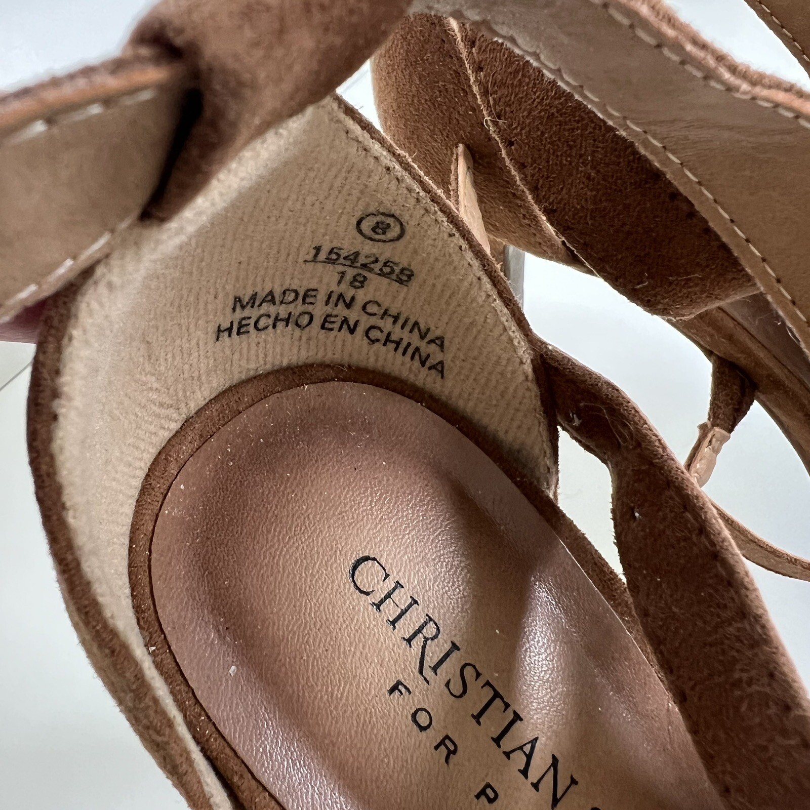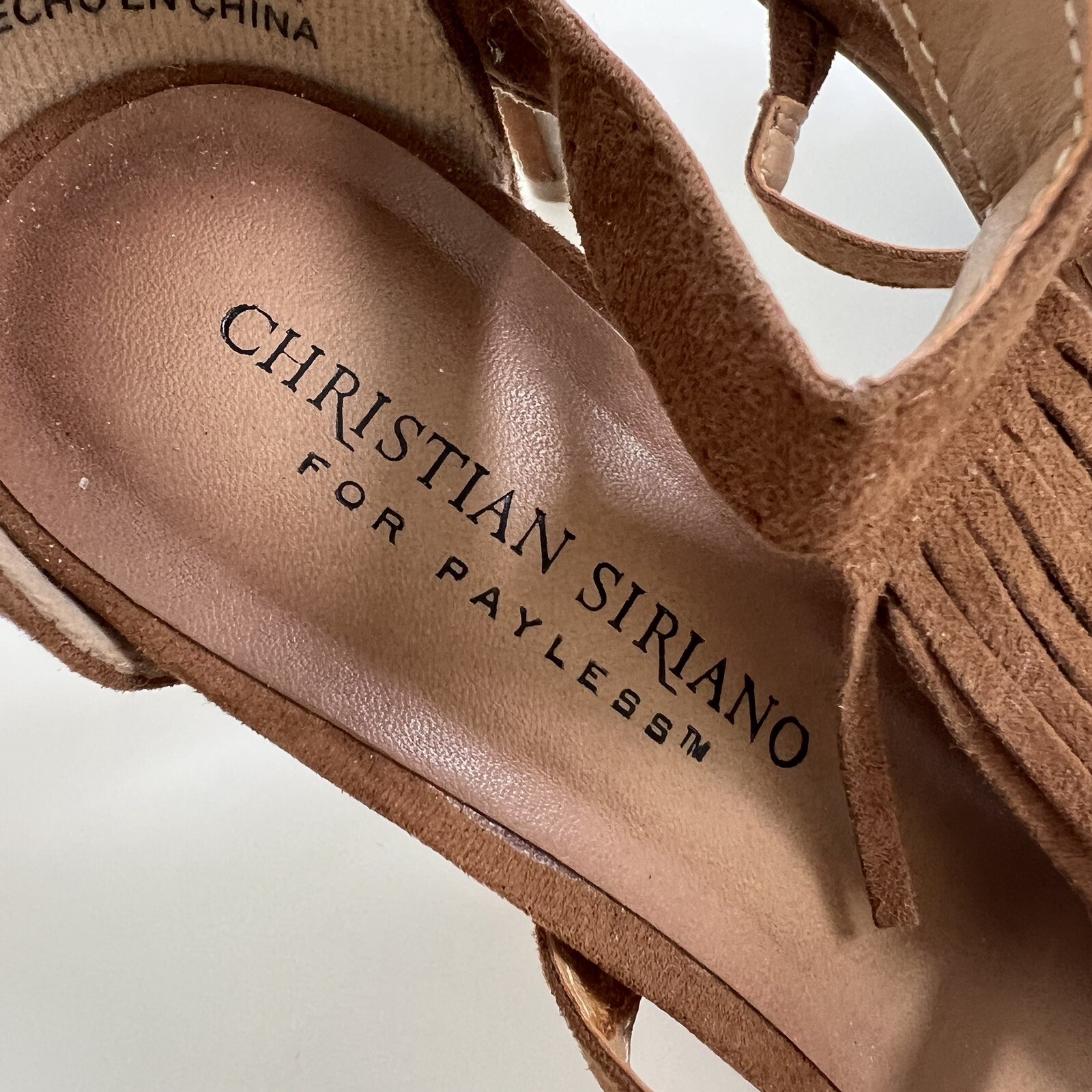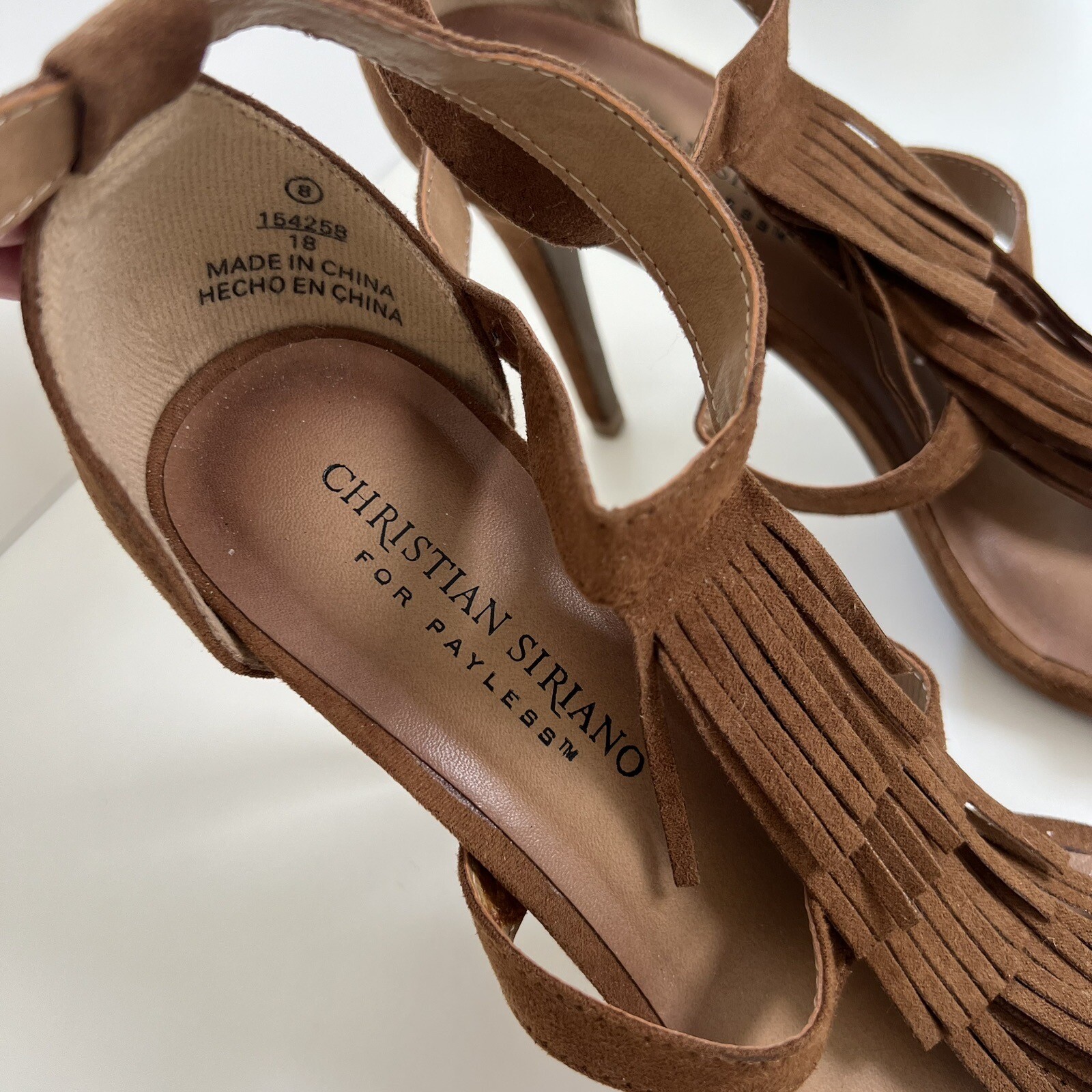 Christian Siriano for Payless strappy fringe 3.5" heel sandals cognac-colored faux suede upper open-toe design and ankle strap with adjustable buckle closure 3.5" stiletto heels Size 8 Unworn. Excellent condition. See photos. Ask questions. Thank you!