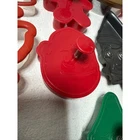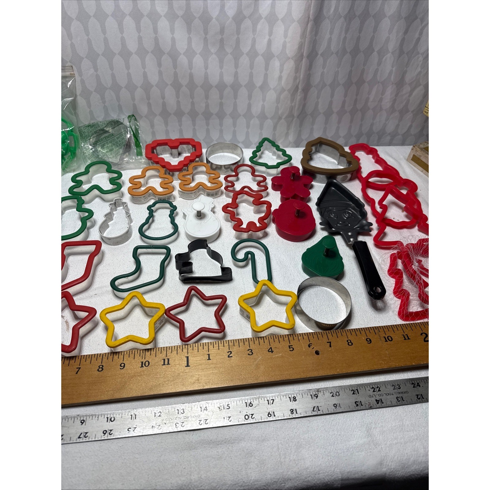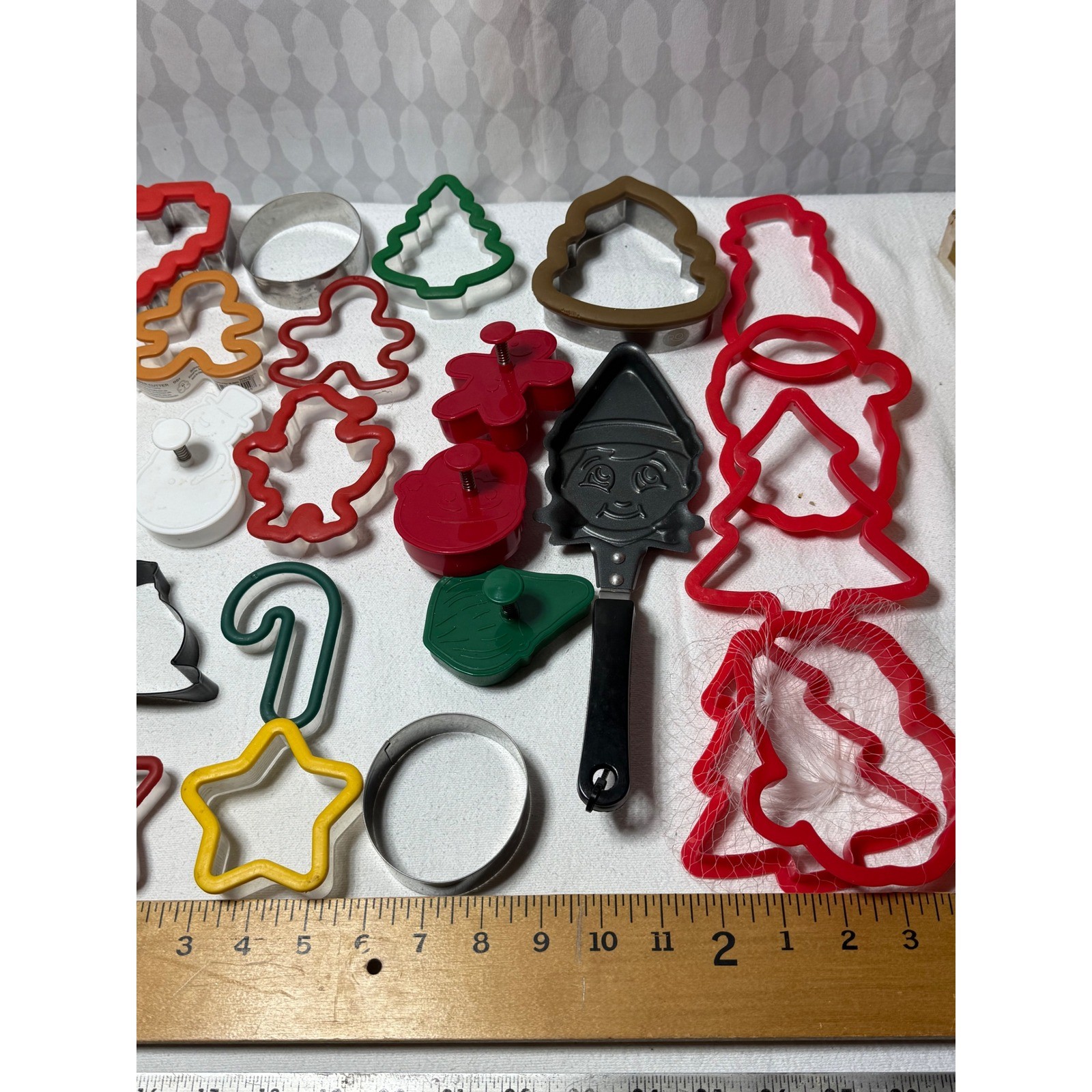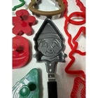 A large collection of Christmas-themed cookie cutters for baking fun. This set includes various shapes such as gingerbread men, Christmas trees, stars, stockings, candy canes, bells, snowmen, angels, and a pumpkin shape. Also includes a metal elf face mold with a handle for creating small cakes or treats, and a green gnome-shaped cutter. Perfect for holiday baking, crafting decorative cookies, or making festive treats for parties. Keywords: holiday baking, festive treats, gingerbread, seasonal shapes, cookie molds, crafting supplies, winter holidays, kitchen tools, party favors, family fun, DIY baking, snowman, angel, candy cane, stocking
