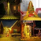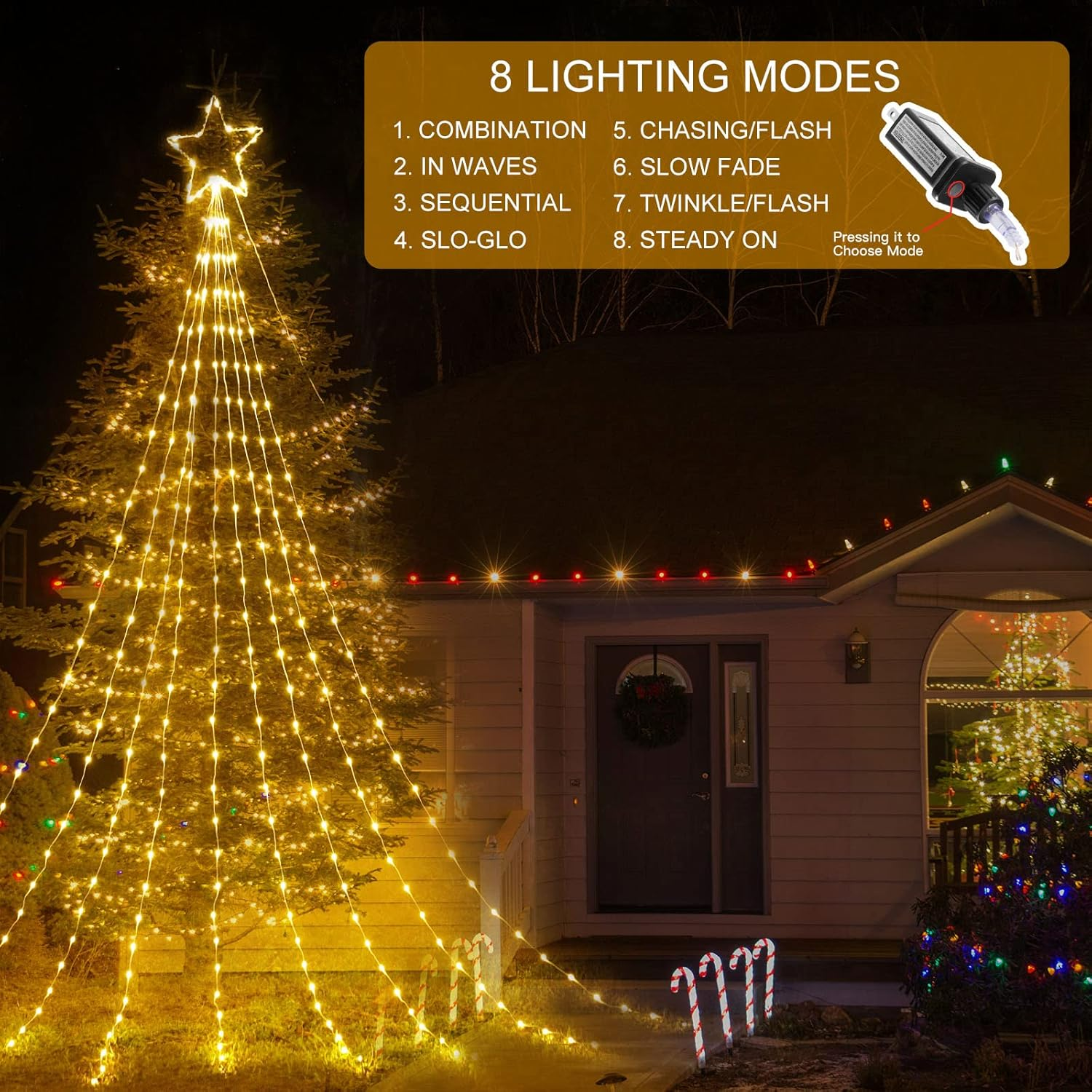 Magical and Cozy Decor: Transform your home into a cozy winter wonderland with our Christmas tree decoration lights. The 11-inch topper star and 9 strings of warm white lights, each 11.8 feet long, add a touch of elegance to your holiday decor. Plus, with 1 hanging string and 9 ground spikes, these lights are perfect for versatile outdoor decorating. Versatile Indoor and Outdoor Use: IP44 waterproof and perfect for outdoor spaces like yards, fences, and plazas, as well as indoor spaces such as hotels, restaurants, cafes, and malls. Illuminate any space and create a festive ambiance for any occasion. Multiple Lighting Modes: Choose from 8 adjustable lighting modes, including combination, in waves, sequential, slow glow, chasing/flash, slow/fade, twinkle/flash, steady on. Press mode button selects 8 different modes to satisfy your diverse needs. Safe and Convenient: Our lights come with a timer function - holding the press button on the adapter for about 3 seconds to set the 6 hours on and 18 hours off timer. These lights are touchable at low temperatures and come with a press-and-hold adapter button, ensuring they are safe to use. Great Gift for Any Occasion: These Christmas lights are easy to assemble and store, making them a perfect gift for any occasion. From New Year's to weddings, holidays, and anniversaries, give a festive gift that will bring joy and warmth to any home. Your loved ones will treasure this thoughtful and practical gift for years to come. Product description Christmas Star Waterfall String Lights - indoor & outdoor Decoration Outdoor waterfall star string light will light up your Christmas and holiday seasons! With 16.4ft extension cord, upgraded 11in iron topper star and 9 strands 11.8ft long light strings. You can hang this shooting star Christmas light on the roof or on the top of a tree. Perfect for decorating Christmas Tree, backyard, porches, patio, garden, wall, window, bedroom, living room, wedding, and party, etc. It is also an ideal gift for your family and friends. Christmas String Lights-Holiday Decoration 8 Lighting Modes 1. Combination 2. In Waves 3. Sequential 4. Slo-Glo 5. Chasing/Flash 6. Slow Fade 7. Twinkle/Flash 8. Steady on Memory function It's easy to set the lighting in the previous mode without resetting it.When you plug in the light again, the light-up mode will continue the mode when it was turned off last time Specification LED Color: Warm white Material: Copper+PVC Power Source: Corded Electric LED Quantity: 344 Waterproof level: IP44 Mode: 8 Lighting Modes Wire Length: 11.8Feet IP44 Waterproof & Safe to Touch This waterproof LED star string light is IP44 waterproof, can be used indoor and outdoor, is made with a high-quality wire, is below the safe voltage for the human body, and saves energy. The bulb does not heat up and allows you to touch it at any time. Outdoor Decoration The lead wire of the waterfall meteor light has 16.4Feet, and there is a tie wire that can be directly tied to the roof and tree, It is the great choice for Christmas decoration outside the house Indoor Decoration The 9-strand light string can be twisted and wound at will, and it can be wound around the Christmas tree or other homes at will. You can decorate your room at Christmas. It is the great Christmas gift for colleagues, relatives, classmates and yourself Atmosphere Decoration Bright and warm lighting creates a romantic atmosphere and is the first choice for proposal and wedding decoration