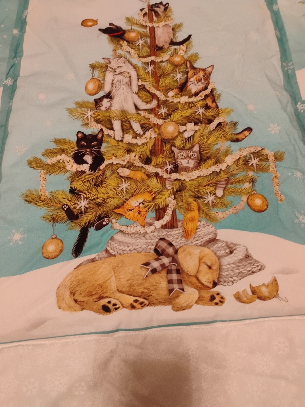 Christmas Dogs Cats Blue Background Cotton Quilting Fabric Panel This panel is 100% cotton and is approximately 24 inches x 44 inches (60.96 cm x 112 cms). Repeat: 24 inches Weight: 4.3 oz. per square yard.