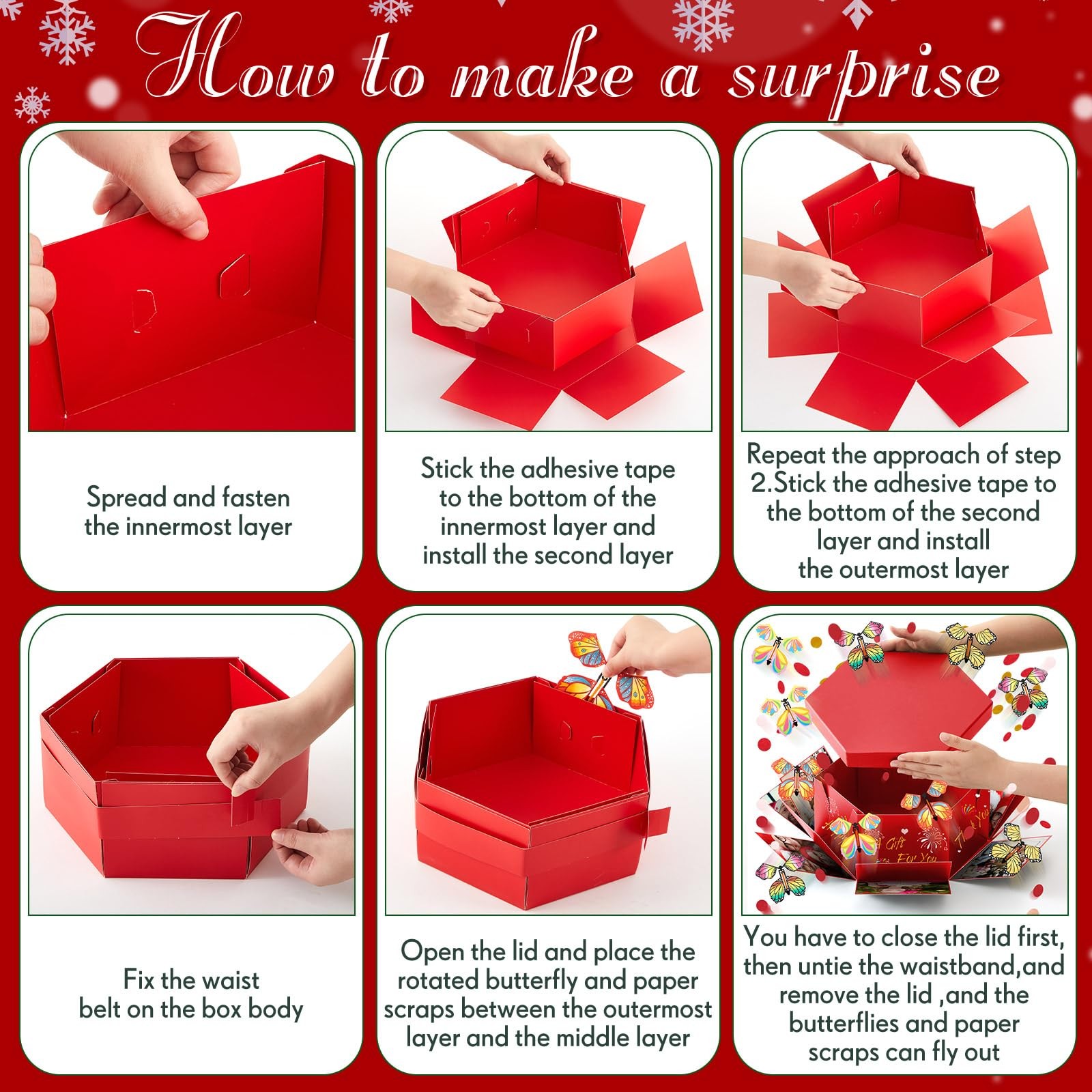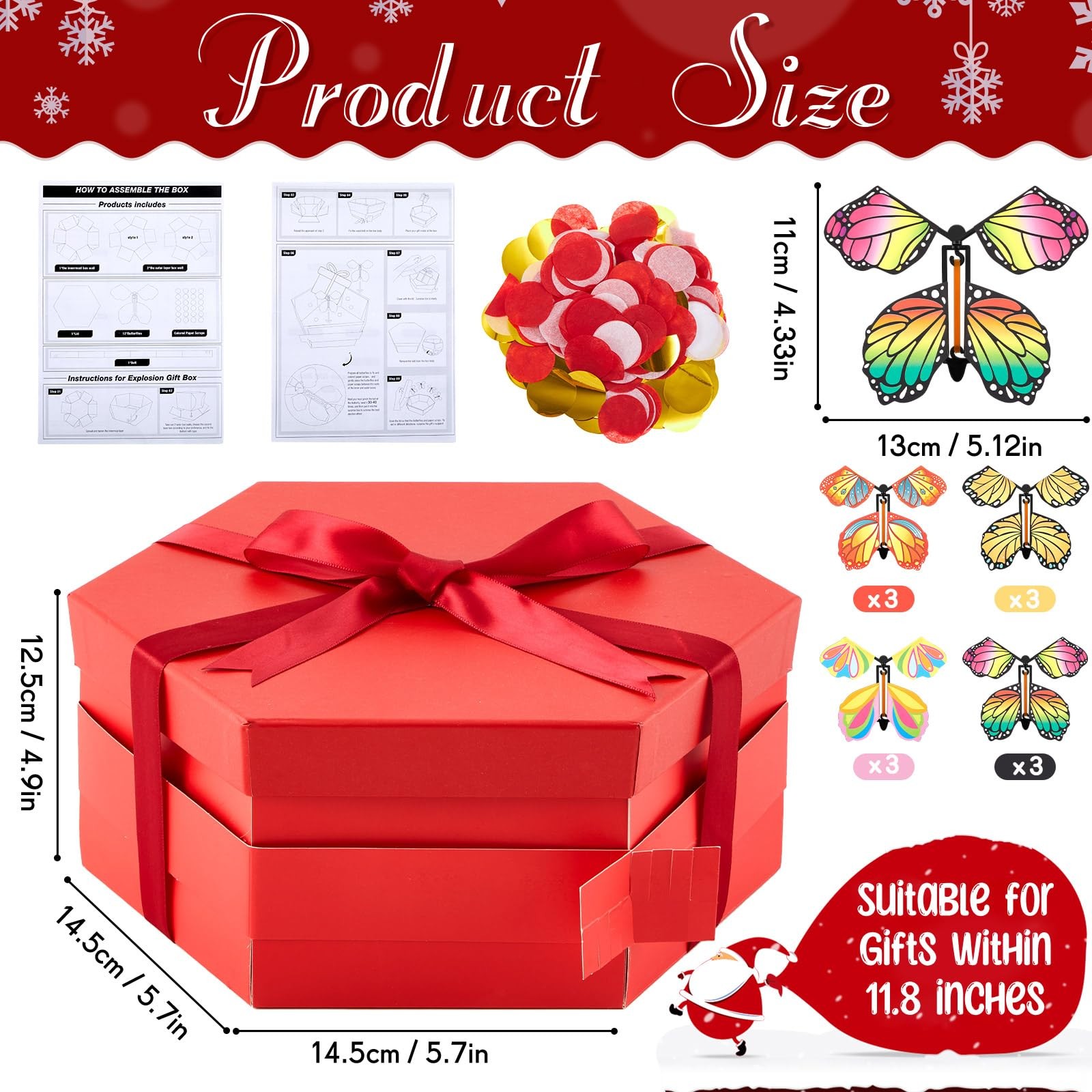 Features: Record beautiful moments: Whether it's your partner's birthday, your friend's special day, your parent's celebration ,a friend's festive occasion, or Christmas day.this DIY surprise gift box promises a creative and entertaining surprise experience, capturing their surprised expressions. Exquisitely crafted box: Crafted with attention to detail, this DIY explosion gift box is exquisite, radiating joy and surprise with its pleasing aesthetics. Besides, it's easy to assemble, adding to your convenience. Specifications: Material: card paper, rubber bands Color: red Size: Box: about 5.7 x 5.7 x 4.6 inches Ribbon: about 0.98 inches Package includes: 1 x Butterfly explosion gift box 12 x Ejecting butterflies 2 x Bag of colorful confetti 1 x Ribbon 1 x Double sided tape Notes: Manual measurement, please allow slight errors on size. The color may exist a slight difference due to different screen displays. Small parts included, please keep them away from little kids to avoid swallowing risk. Suitable for people over 14 years old, and it's recommended to use under the supervision of adults in case of choking risk Easy to Assemble: take a butterfly box, start rotating the rubber band, after about 30-40 times, put the rotating butterfly into the inner layer of the box, and so on, put the butterflies around, sprinkle some colorful confetti, and then close the lid; We also provide instructions to make it easier; Please note: twist the catapult butterfly to the appropriate number of turns for a surprising explosion and flying effect Delightful Surprise: this butterfly surprise gift box includes 1 red explosion gift box, 12 ejecting butterflies, 2 bags of colorful confetti, a roll of ribbon and a double sided tape, suitable for sparking joy and excitement, providing a wonderful unboxing experience; Rich colors, it leaves a lasting impression Easy to DIY: featuring a red design, the butterfly surprise gift box keeps its surprise element intact; You can tape the memory-filled photos on the surprise gift box and writing words. The center of the gift box provides you with a large space where you can place a sweet little cake, beautiful flowers, cute little dolls and other gifts, offering ample room for your tokens of love Quality Material: our flying butterfly box is constructed from card paper; The ejection butterflies are powered by safe rubber bands, making the entire product safe and user friendly; Please note: twist the catapult butterfly to the appropriate number of turns for a surprising explosion and flying effect Versatile Gift: the explosion gift box is a versatile present, suitable for creating an ambiance of surprise; It's an ideal choice for colleagues, family, and loved ones for Christmas,birthdays, anniversaries, Valentine's Day, Mother's Day, Father's Day and many other celebrations
