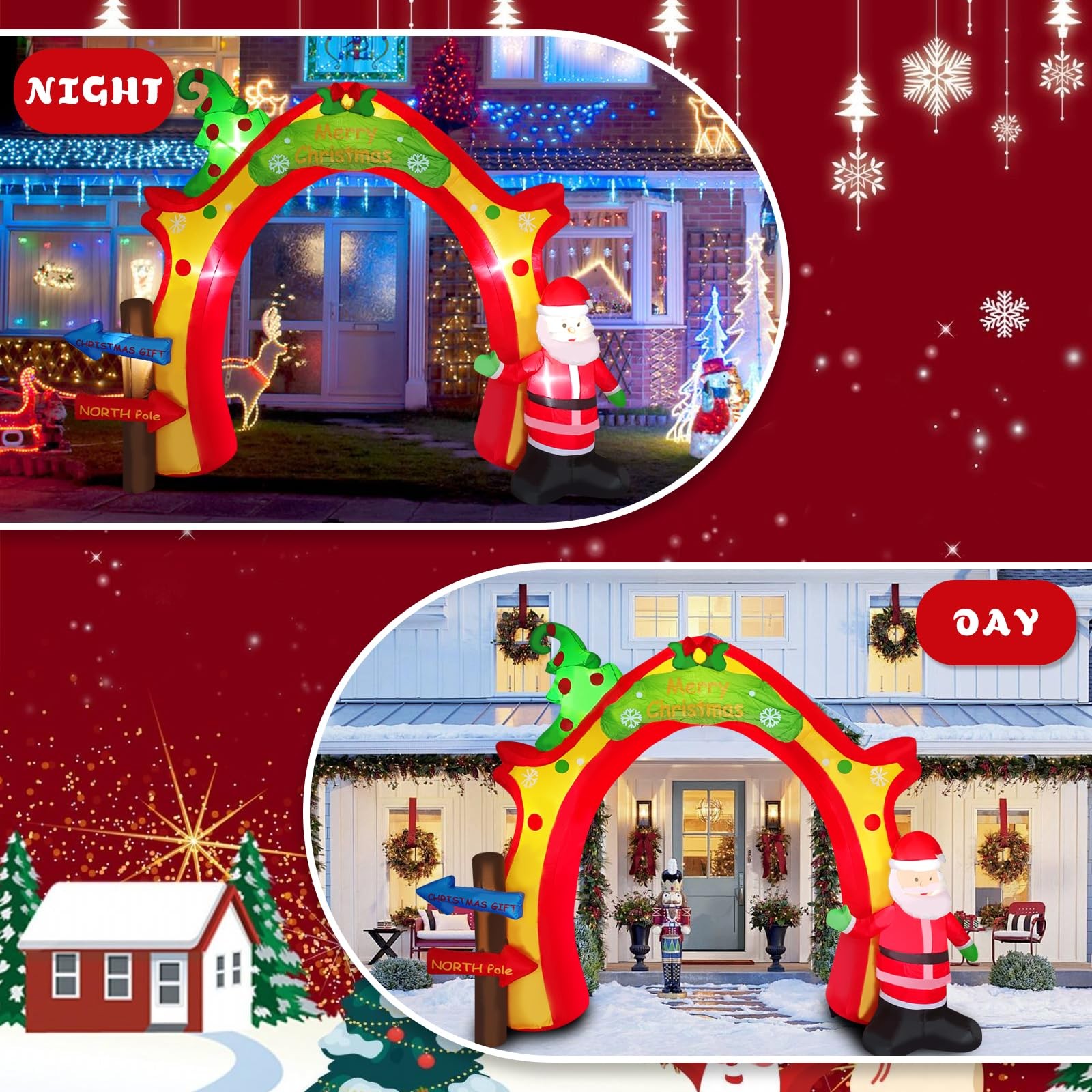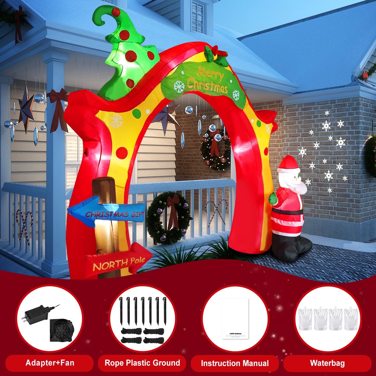 Filled with sweet, warm expectations, the streets are lined with festive costumes, silly snowmen, sleighs full of gifts, and Christmas trees hung with ornaments, colored balls, bells, ribbons, and stars streaming under the lights with a dreamy sheen. The magical moment of Christmas Eve has come. amazing Giant Inflatable Christmas Arch Decoration helps you light up the dreamy Christmas night and create a magical Christmas for you! It brings the joy and blessings of Christmas to your home, patio or store front in the most dazzling and eye-catching way. ▶Spectacular Festival Landmark: large inflatable design creates an imposing archway that instantly enhances the festive atmosphere and becomes the focus of attention in the neighborhood. ▶Classic Christmas elements: the arches are carefully decorated with classic festive motifs such as a silly Santa Claus and a green Christmas tree full of presents, all in bright and full colors. ▶Built-in LED lighting: Night is its home ground! Built-in energy-saving LED light, the pattern is shining under the light, creating a warm, romantic and dreamy Christmas night scene, making your home full of holiday magic light! ▶Durable and portable easy to store: Made of thickened polyester, windproof and waterproof, sturdy and durable. It can be easily deflated and folded for storage at the end of the festival without taking up space. ▶Widely used scenes: home yard, front lawn, shopping mall entrance, store window, community square, Christmas party scene... Anywhere you need to add Christmas atmosphere, it is the perfect choice! Make this Christmas special! This giant inflatable Christmas arch is more than just a decoration, it is a magic door to create joyful memories for family, friends and all who pass by. Get your hands on it now and welcome Santa Claus in the brightest and most colorful way to start your own dreamy Christmas season! 【Light Up The Festive Atmosphere】Christmas inflatable decorations bring you great surprise, built-in high brightness LED lights, low power consumption, energy saving, long time lighting is not a burden, in the night automatically light up, outlining the arches, Santa Claus, Christmas trees, and other classic elements, to become the most eye-catching outdoor focal point, so that your home or store instantly filled with a rich Christmas magic 【Large Inflatable Modeling & Christmas Elements】This Christmas archway outdoor decoration adopts large inflatable design, which makes Santa Claus, Christmas tree and other elements three-dimensional full, vivid and lively, full of childish fun and sense of joy. The large volume brings a strong sense of visual presence, making the holiday decoration effect more shocking and eye-catching 【Quick Build & Easy to Use】It only takes a few minutes to complete the whole Christmas Inflatable blow-up yard decoration on one shoulder, no need for complicated assembly! Simply find a flat ground, spread out the arch, connect the built-in blower power supply, it can be automatically inflated and shaped in a very short time, say goodbye to the tedious holiday decoration setup troubles, and enjoy the holiday time easily. 【Reliable Material Shines Throughout the Christmas Season】Made of thickened and abrasion-resistant polyester material, it has excellent waterproof, windproof and UV protection performance. Sturdy anchors will be fixed on the ground and stand firmly in rain and snow, the built-in LED lights are waterproof design and 12V voltage, which is safer and ensures continuous and stable illumination throughout the Christmas season, fearless of the challenges of bad weather 【Widely Applicable & Cozy Guardian Christmas Eve】This inflatable arch decoration for Xmas is perfect for parties, lawns, schools, shopping malls and so on, indoor and outdoor can be used, build an unforgettable and delightful scene for you, perfect for Christmas parties, let the cozy lights safely light up every Christmas Eve