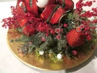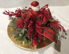 Christmas Round Centerpiece Santa Red Berries Plaid Ribbon Greenery Glisteny Playful Arrangement on a brass tone charger plate. 12 in. round. Mixed greenery with sparkle. Red berries and some frosted berries. Red Green plaid bows. Santa is in center position.