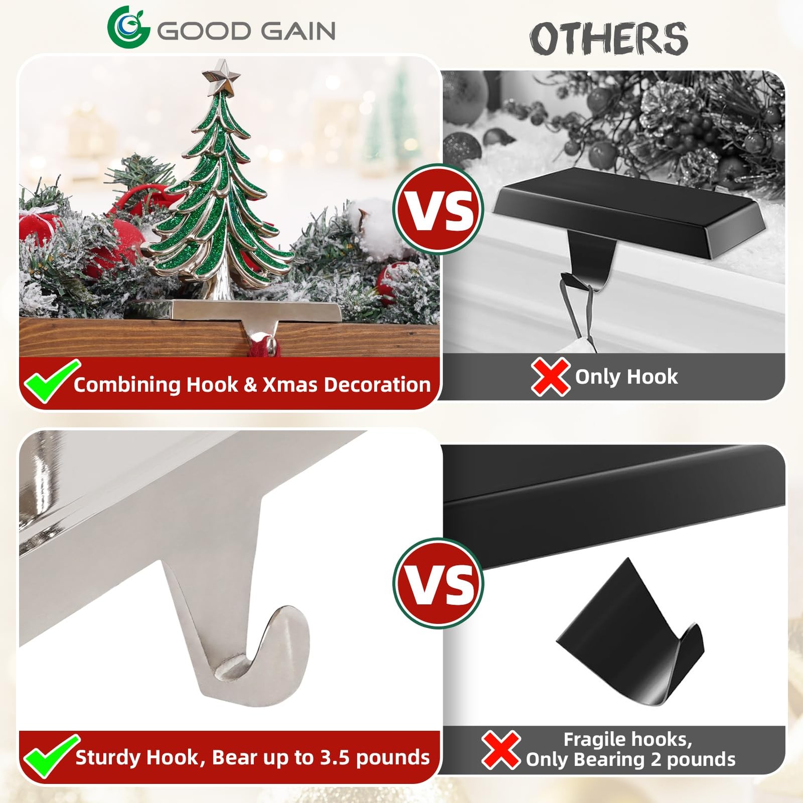 This Christmas, elevate your holiday decor with our exquisite collection of hand-painted fireplace stocking holders! More than just functional hooks, they are miniature pieces of art designed to capture the of the season. Whether you're crafting a cozy scene around the fireplace or adding festive touches to your shelves, our unique designs—the Christmas Tree, Reindeer, Snowflake, Snowman—will become the heartwarming centerpiece of your celebrations, creating memories that last a . Features: 1. Stunning handmade artistry that elevates festive decor — charming designs (Christmas Tree, Reindeer, Snowflake, Snowman) feature exquisite hand-painted detailing to enhance your mantle, shelves, or entryway during the holidays. 2. Solid metal construction with a silver base — Durable, long-lasting stocking holders that stand up to full stockings year after year, delivering reliable through many seasons. 3. Generous weight capacity of 3.5 lb — Built to securely hold stockings, gifts, or lightweight decor without tipping, so Santa’s gifts stay put. 4. Stable, non-slip bottom for protection — Rubberized anti-slip pads safeguard mantels and surfaces while preventing unwanted movement. 5. Versatile holiday décor and gift-ready — Christmas icons that fit a variety of home styles; the handmade finish makes them thoughtful gifts for family and friends. 6. No Installation Required — Simply place on your fireplace mantel, shelf, desktop, or windows without tools or assembly required. 7. Sleek Silver Shine & Easy Care — The stocking hooks for mantle is made of high-quality metal and silver hooks. The sturdy metal hooks will not bend under . There is no need to clean and maintain the stocking rack frequently, just wipe it with a dry cloth to restore the mirror-like luster. It still looks brand new to welcome Santa Claus when he comes. 【Exquisite Christmas Stocking Hangers】 Bring the feeling of Christmas to life with our unique collection of stocking holders (Tree, Reindeer, Snowflake, Snowman). Each stocking hook feature exquisite hand-painted detailing to enhance your mantle, shelves, or entryway during the holidays, elevates festive decor. 【Sturdy & Heavy-Duty Construction】Crafted from high-quality metal, these weighted stocking holders are built to last for many Christmas seasons to come. They are rust-resistant and sturdy enough to securely hold your stockings even when filled with goodies, ensuring your festive display remains perfect throughout the holidays. 【Non-Slip Base & 3.5lbs Strong Hold】These mantle hooks for stockings features a weighted base with a fabric felt anti-slip pad, prevent scratching or sliding on your mantel, shelves, or . With a reliable 3.5lbs weight capacity, you can confidently hang stockings with gifts without worrying about tipping over. 【Versatile to Use】Perfectly designed for mantels fireplace christmas decorations, but also ideal for decorating bookshelves, staircases, counter, window, console tables, or windowsills. These mantle stocking hangers are not just for stockings; use them to hang Christmas cards, lightweight garlands, or small holiday wreaths for a cohesive look. 【Perfect Holiday Gift】Beautifully designed and practical, these stocking hangers for mantel make a thoughtful gift for family and friends. Their timeless appeal and functional design bring warmth and joy to any Christmas decor, creating cherished memories season after season.