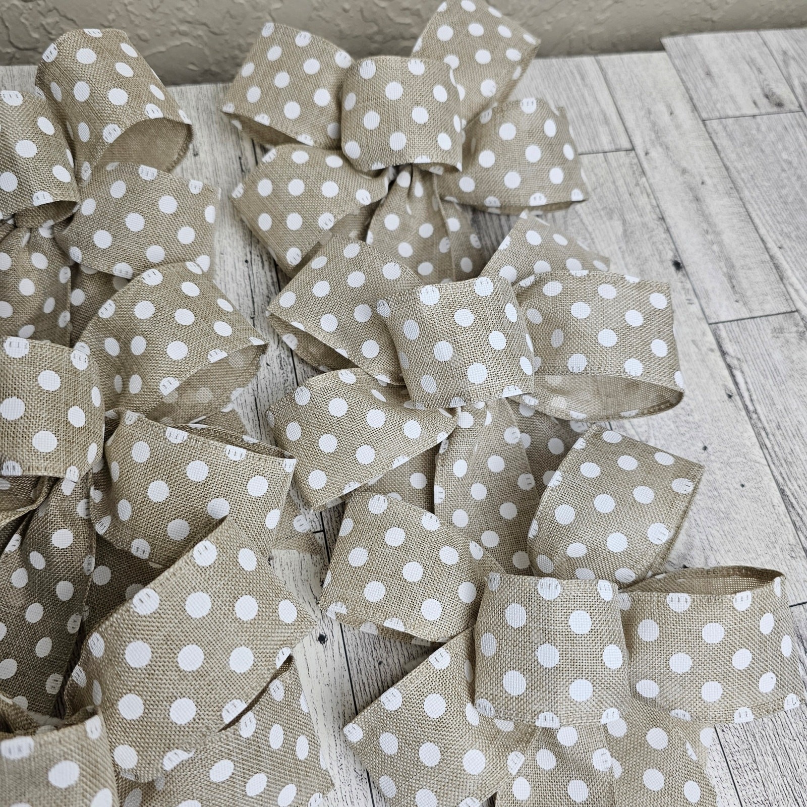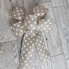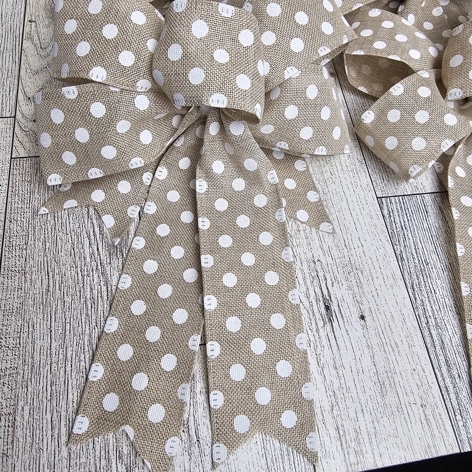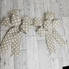Christmas Tree Bows, Set of 6 Beige Polka Dot Bows, Holiday Bows, Christmas Wreath, Tree Decor, Christmas Ornament, Neutral Bow, Tiered Tray -New and Handmade at time of order These beautiful bows would be perfect on your Christmas tree, tiered tray, presents, tree, staircase, garland or anywhere you would like to add seasonal decor! They also have an added chenille stem in the back for easy attachment. -Set includes 6 bows -These bows are made with a beige polka dot 1.5" wide wired ribbon -The measurements are approximately 6” wide and the total length with tails is about 6” long. -All bows are handmade. Due to the movement during shipping, the bows may need to be re-shaped or fluffed to reach your desired look. Same day / next day shipping Offers accepted Like for price drops and deals Bundle 2 items or more and save! Thank you! 10OZ