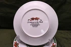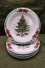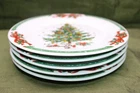 Set of 5 Holiday "Christmas in the Park" Salad Plates Made in China White porcelain, with green band near rim, green holly and red ribbon on border. Large central decorated Christmas Tree Measurements: (5) 7 1/2 " rim diameter, weighs 10.8 oz each Condition: Excellent, no chips, no cracks, bright colors, no utensil marks of normal use, no crazing, one plate has one smooth, black dot on white and one plate has two, smooth black dots on white, one plate has a spot of green paint on white. Thanks For Looking