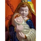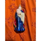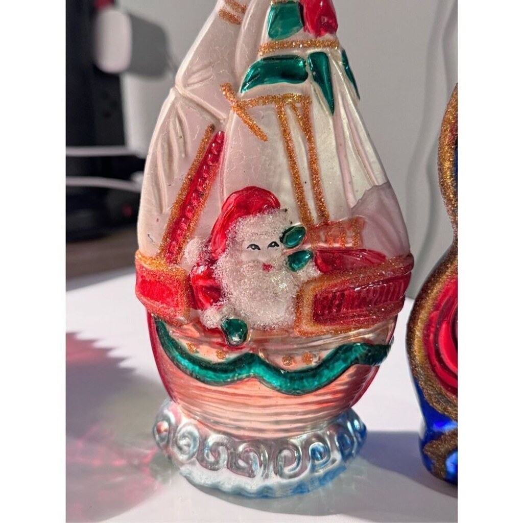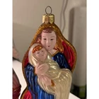 Santa's best European style glass. Mouth blown. Hand crafted. 1996. Mother and child ornament box has some wear. Ornament has two paint scratches. The ornament itself is 7 1/2 inches tall. The box is 10 inches tall. The second ornament is Santa. Sparkly and glittery, Santa is peeking out of his basket. Both have their original boxes. The have some wear. Santa has a rub on his back. Overall they are just stunning . An eye catcher.