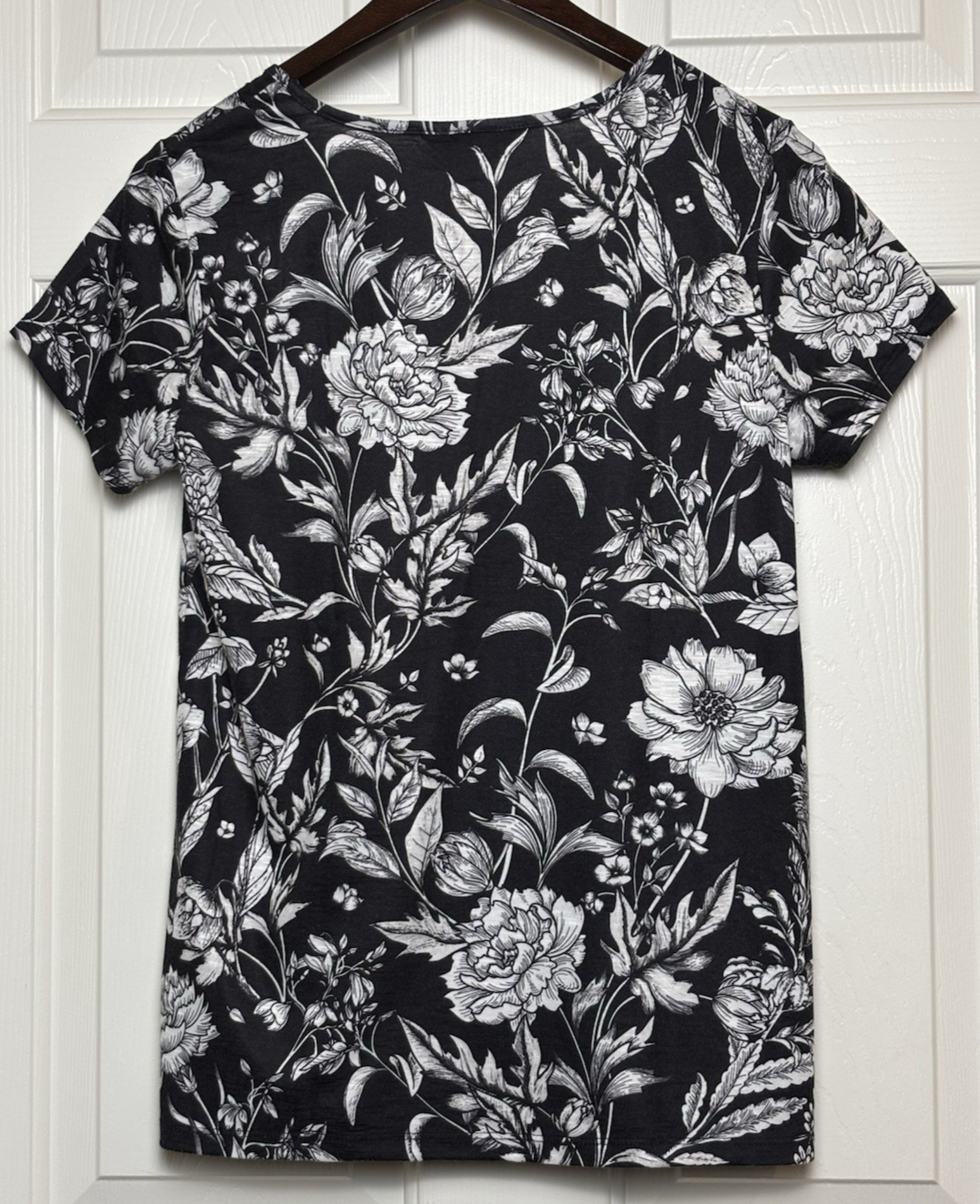 The Christopher & Banks Short Sleeved Top in Black & White Floral is a stylish and versatile piece for women's casual wear. Made of polyester and spandex, this knit blouse features a round neck, pullover closure, and a regular fit. The floral pattern adds a touch of feminine flair, making it perfect for all seasons including summer, fall, and spring. With its basic style and easy care instructions (machine washable), this top is a convenient and fashionable addition to any wardrobe. Measurements: Armpit to Armpit (Chest): 18.5" Length from top of Shoulder: 25” Sleeve Length (from shoulder seem to end of sleeve): Short Sleeve Details of Note: Crew Neckline Flaws noted: None