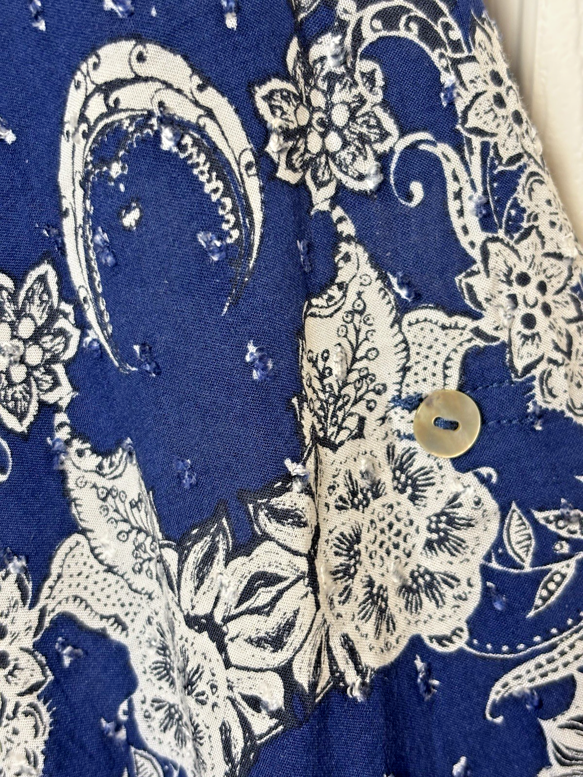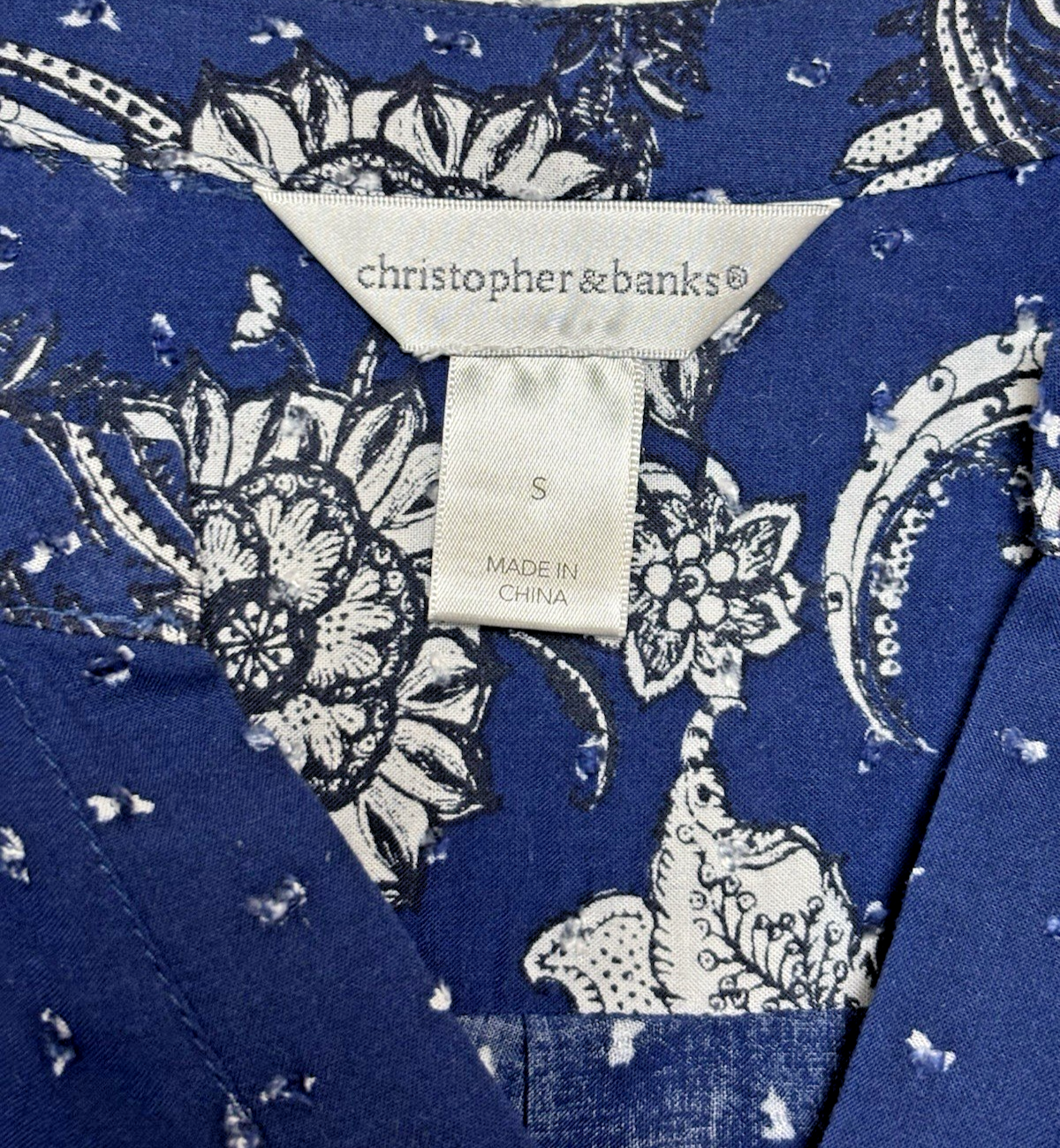 The Christopher & Banks 3/4 Sleeved Top with a blue and white floral pattern is a stylish and versatile piece for women's casual wear. Made of rayon, this blouse features a v-neck, pullover closure, and a small fit. The floral pattern adds a touch of feminine flair, making it perfect for all seasons including summer, fall, and spring. With its basic style and easy care instructions (machine washable), this top is a convenient and fashionable addition to any wardrobe. Measurements: Armpit to Armpit (Chest): 19.5" Length from top of Shoulder: 25” Sleeve Length (from shoulder seem to end of sleeve): 3/4 Sleeve 19" Details of Note: V-Neckline Flaws noted: None