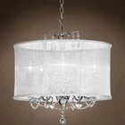 The White Organza Fabric Shade Softens The Light While The Clear Authentic European Crystals add Elegance to Any Space. Adorned in a luxurious Chrome finish, this fixture is mounted on a chain and the overall height can be adjusted up to 93" tall. Can be mounted on a flat or slanted ceiling. Featuring Five Lights strategically positioned to amplify the brilliance of the design. Compatible with all bulb types, including LED. Fully Dimmable. Features: Designer: Joshua Marshal Collection Name: Shaded Light Frame Color: Chrome Finish Shade Color: White Crystal Quality: European Crystal Color: Clear Bulb Included: No Bulb Count: 5 Bulb Type: E12 Dimmable: Yes Voltage: 110-120v Height Adjustable: Yes Weight: 9 poundsDimensions: Width: 20 Inches Height: 19 Inches Minimum Free Shipping Over $49.99* Details Chrome Crystal Chandelier 5 Light 20" White Drum Shade Pendant Lamp - 20" Wide Product Description: The White Organza Fabric Shade Softens The Light While The Clear Authentic European Crystals add Elegance to Any Space. Adorned in a luxurious Chrome finish, this fixture is mounted on a chain and the overall height can be adjusted up to 93" tall. Can be mounted on a flat or slanted ceiling. Featuring Five Lights strategically positioned to amplify the brilliance of the design. Compatible with all bulb types, including LED. Fully Dimmable. Features: DesignerJoshua Marshal Collection NameShaded Light Frame ColorChrome Finish Shade ColorWhite Crystal QualityEuropean Crystal ColorClear Bulb IncludedNo Bulb Count5 Bulb TypeE12 DimmableYes Voltage110-120v Height AdjustableYes Weight9 pounds Dimensions: Width20 Inches Height19 Inches Minimum Height24 Inches Maximum Height93 Inches Wire Length92 Inches Canopy Width5 Inches Canopy Height1.5 Inches