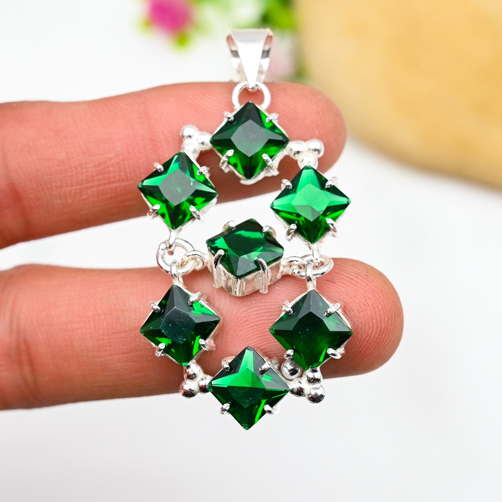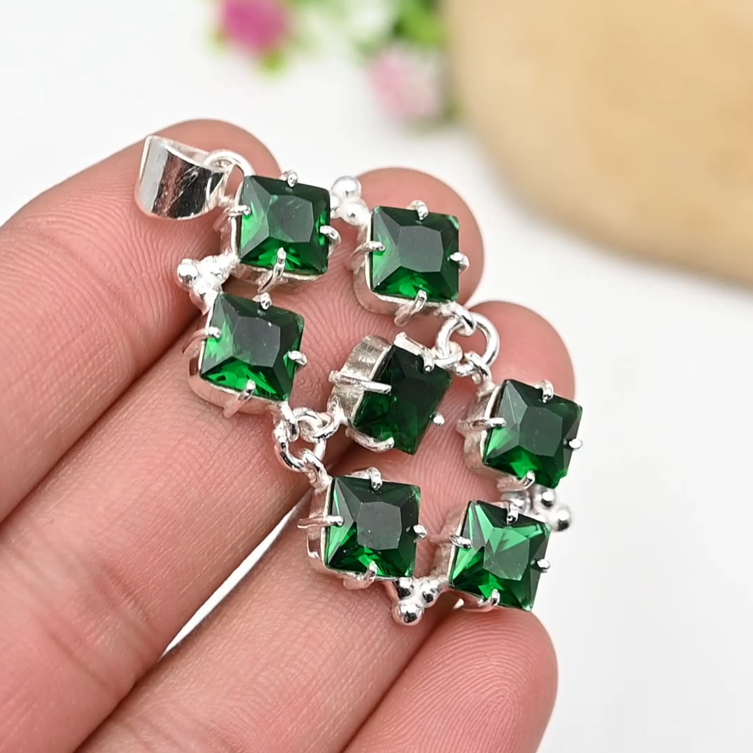 Number of Gemstones:7Colored Diamond Intensity:N/APendant Shape:Same As PictureCountry/Region of Manufacture:IndiaCountry of Origin:IndiaMain Stone Shape:CushionMain Stone Creation:NaturalCut Grade:N/AClosure:Same As PictureTheme:Beauty, Bohemian, Ethnic, Halloween, Love, NatureType:PendantMain Stone Treatment:Not EnhancedChain Type:N/ANecklace Length:2.16 "Total Carat Weight:10 carat and aboveMetal:Sterling SilverBase Metal:Sterling SilverMain Stone:Chrome DiopsideMain Stone Color:GreenStyle:PendantColor:SilverPendant/Locket Type:Same As PictureBrand:HandmadeCertification:N/AFeatures:HandmadeDiamond Clarity Grade:N/AMaterial:GemstoneSetting Style:BezelOccasion:Anniversary, Birthday, Christening, Christmas, Engagement, Father's Day, Graduation, Mother's Day, Valentine's Day, WeddingMetal Purity:925Secondary Stone:Chrome DiopsideNumber of Diamonds:N/ACollection:HandmadeDiamond Color Grade:N/A