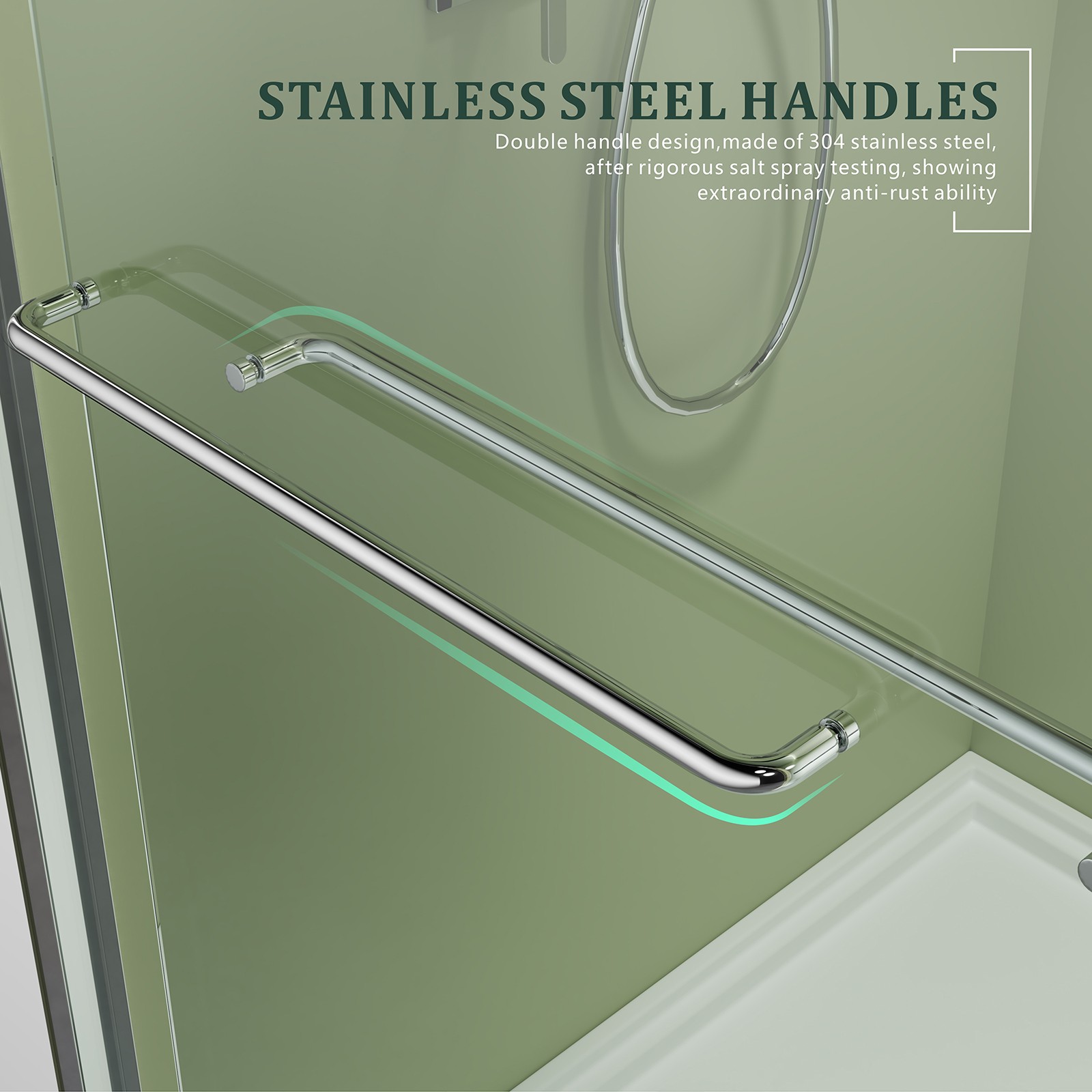 Double Sliding Glass Shower Doors for Walk in Shower Design The 56-60''x 57'' tub chrome frameless shower doors allows you to use either on the left or right door to access the tub, a space-saving solution. Hardware Finish:Chrome. Adjustable Width The top rail can be trimmed 4 inches for width adjustment (56-60 inches) by cuting the top and bottom rais. Our bathtub frameless shower doors are designed to fit most standard tubs and provide a sleek, seamless appearance. Upgrade your bathroom with a stylish chrome glass sliding door that combines appearance and function. Safety Tempered Glass The tub glass shower doors for walk in shower is designed with SGCC/ANSI-certified 1/4" (6mm) thickened clear tempered panel, which not only creates a spacious and open feeling, but also effectively resists damage. Durable and easy to maintain, it can resist shower water and soap dirt. High-quality Accessories All the hardware of this tub chrome frameless shower doors is high-quality stainless steel, including 2 large solid rollers, 2 handles and thickened top track. High-quality stainless steel hardware ensures smooth, durable and rust-proof. Built-in rollers, tested for 100,000 times for durability, ensure your tub glass sliding door slides smoothly, quietly and durable. The stainless steel handle can be used as a towel rack, provide a place to hang clothes and towels. Easy to install The illustruction and all the necessary installation accessories are in the package, easy to install. Due to the heavy glass, the chrome glass shower doors for walk in shower is recommend to be installed by two professional people. CHROME GLASS SHOWER DOOR ENJOY YOUR CLEAN SHOWER TIME ADVANCED DETAILS DESIGN As a professional bathroom product manufacturer, we always provide you with better products and more efficient services, but the following service terms need to be known to you: 1: If you find some problems with the product after receiving the goods, please do not discard the product, because we need you to provide pictures or videos of the relevant faults to better serve you. 2: Please note that we do not bear the installation/assembly costs. If you find a fault during the installation of the product, we will not bear or reimburse this cost because we stipulate that all parts must be checked before booking. 3: Delivery within the United States only, excluding Alaska/Hawaii, Puerto Rico, Guam, Saipan, APO/FPO, US Protectorates and PP Box. Usually the delivery time is 1 to 7 business days. If you still have not received the goods after 7 business days, please contact us immediately and we will track the order for you. 4: If your goods are damaged when delivered, you must refuse the order and describe the damage on the receipt. Just fill in "the goods are damaged". If you accept the goods and the damage is not noted on the receipt, we reserve the right not to refund or replace your goods. If you are not satisfied with your purchase, please contact us within 7 days. Please note that there is a 20% restocking fee and all shipping and handling charges are the responsibility of the buyer.
