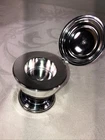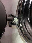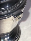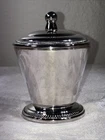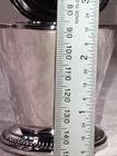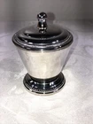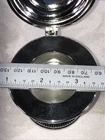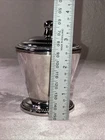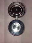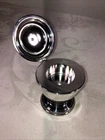 Chrome plated weighted inkwell for quill or calligraphy. Lidded with hinge. Unbranded. Preowned. Made in China. It’s form and styling closely follow weighted inkwells struck in sterling silver from the 1940’s. The closest replica was made in India with no further attribution offered. This is very likely a nickel alloy metal chrome plated since it is not magnetic. Notwithstanding, this is a very nice inkwell in excellent condition. A rare find. No damages to report. Blue velveteen cloth covered base. Original packaging not available. Measures 3 3/4”Tall X 2 3/4”Diameter at Lid X 2 1/4” Diameter Base. Inkwell depth is less than 3/4”. Weighs 9.1 ounces.