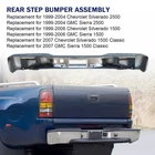 Feature Condition: 100% Brand New Color: Chrome Bumper + Black Step Pad Material: Steel + ABS Plastic Placement on Vehicle: Rear Comes with a Complete Set of Step Pads Requires no Modification or Drilling Upgrade and replace your standard or worn rear bumper with a new one. Professional Installation is Highly Recommended Installation Instruction is NOT Included Fits For 1999-2006 Chevrolet Silverado 1500 For 2007 Chevrolet Silverado 1500 Classic For 1999-2004 Chevrolet Silverado 2500 For 1999-2006 GMC Sierra 1500 For 2007 GMC Sierra 1500 Classic For 1999-2004 GMC Sierra 2500 Fits Models without Parking Sensor Holes Package Include 1×Rear Bumper 1 Set of License Plate Lamp Wiring Harness 2×License Plate Lamps Some bolts and screws On Jul 9, 2024 at 09:48:45 PDT, seller added the following information: On Jul 23, 2024 at 18:01:14 PDT, seller added the following information: On Jul 23, 2024 at 20:34:26 PDT, seller added the following information: On Jan 23, 2025 at 22:37:05 PST, seller added the following information: