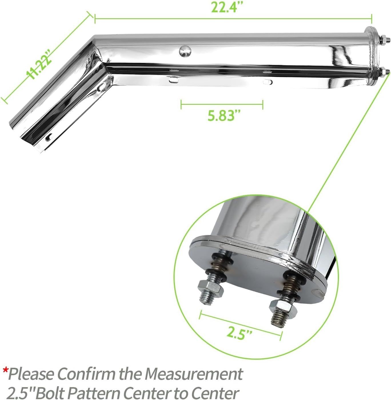 Chrome Angled Mud Flap Hanger Bracket for semi Trucks, Bolt Spacing 2.5", 30" L Heavy-Duty Spring Loaded Hangers with Reflective Strip Sticker, Right & Left Side, 2PCS Details Description: Package Includes All Hardware for Mud Flap Hanger - 1 Pair (2 PCS) Mud Flap Hangers as shown for HD Truck. Information Degree Angled:45 , Bolt Spacing Pattern: 2.5" for Heavy Duty Spring Loaded Mud Flap Hangers for Semi Trucks. Material Made of heavy-duty stainless steel, Not easy to rust. Spring loaded fender hooks for easy installation. Higher wear resistance and longer service life. Fitment Bolt On, equipped with nuts for installing bolts.Universal Fit for(Freightliner // Kenworth // Peterbilt // International // Mack).
