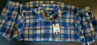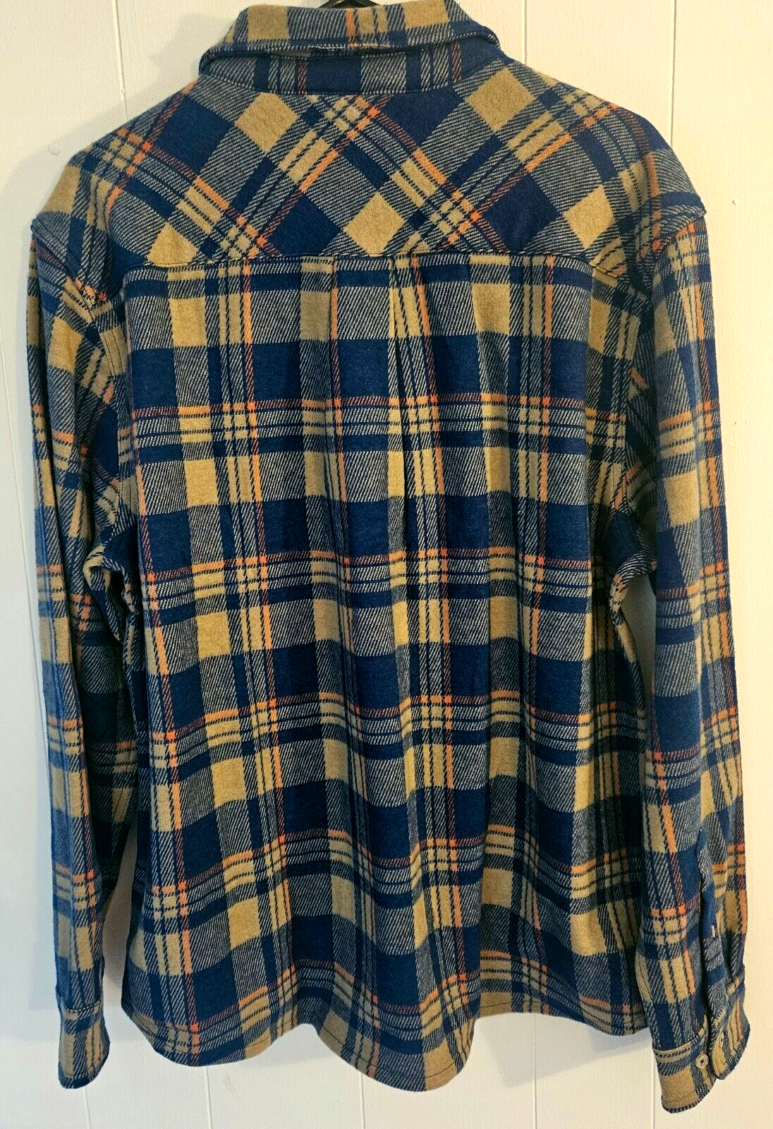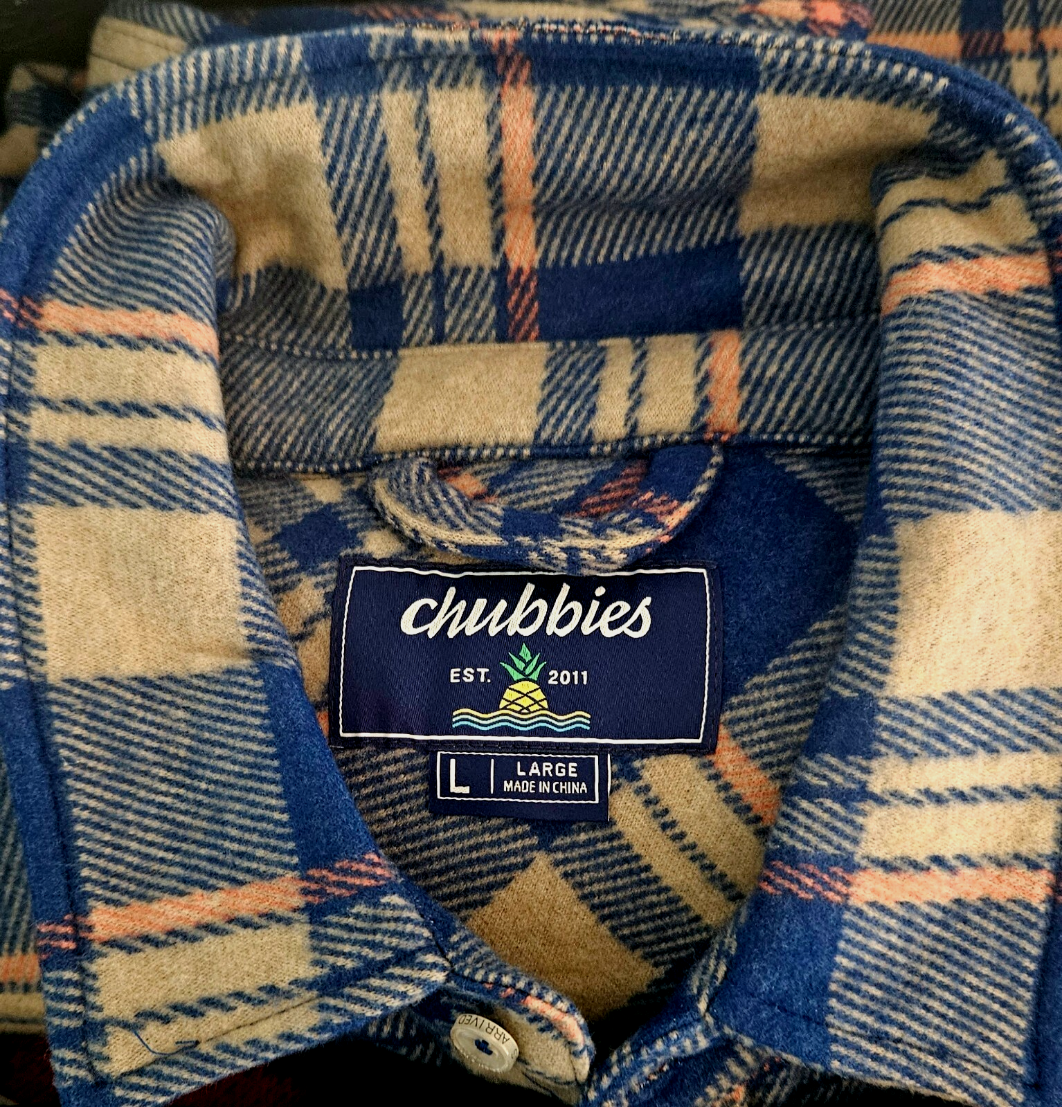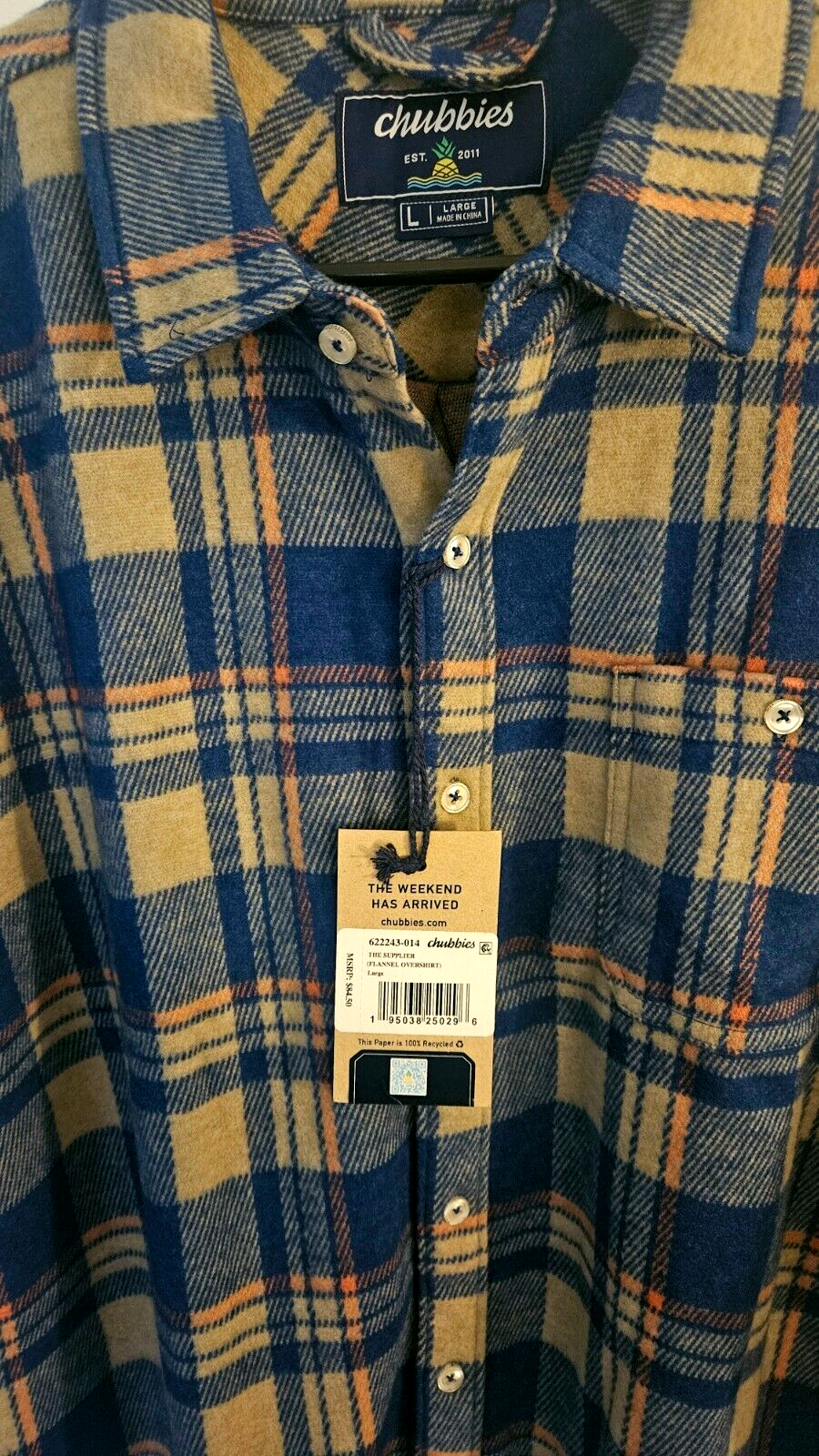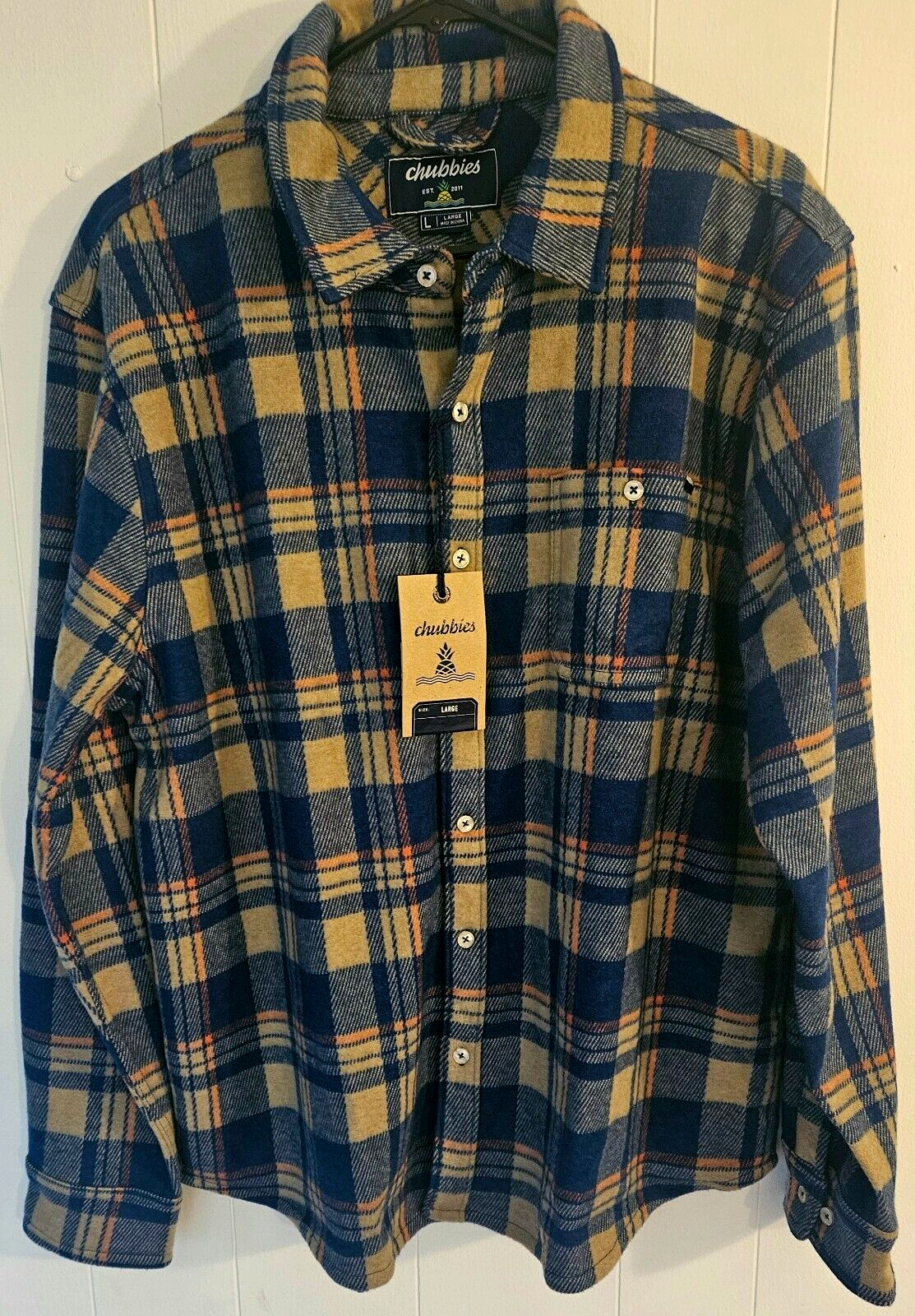 The "Chubbies" The Supplier Flannel Jacket in size LARGE is a stylish and versatile addition to any man's wardrobe. Made from soft and durable polyester flannel, this dark blue jacket features a button-up closure and a classic button-down collar. Perfect for travel or casual wear, this jacket is suitable for winter, fall, and spring seasons. The multicolor plaid pattern adds a touch of style, while the polyester lining ensures comfort and warmth. Perfect for outdoor activities like walking, hunting, or hiking, this Chubbies jacket combines functionality with a trendy design.