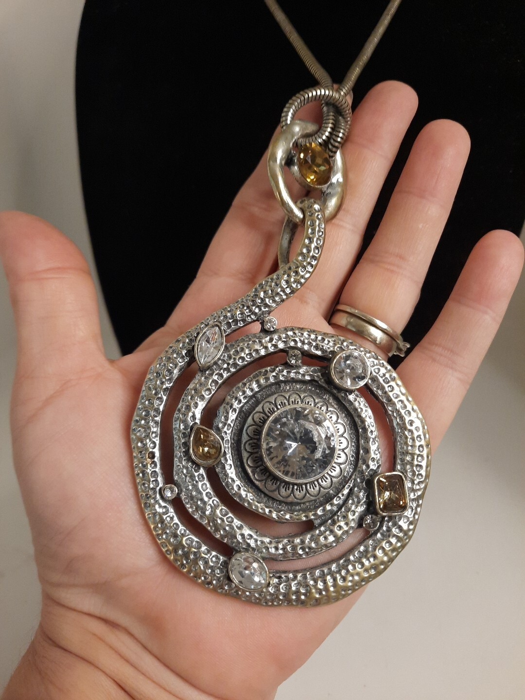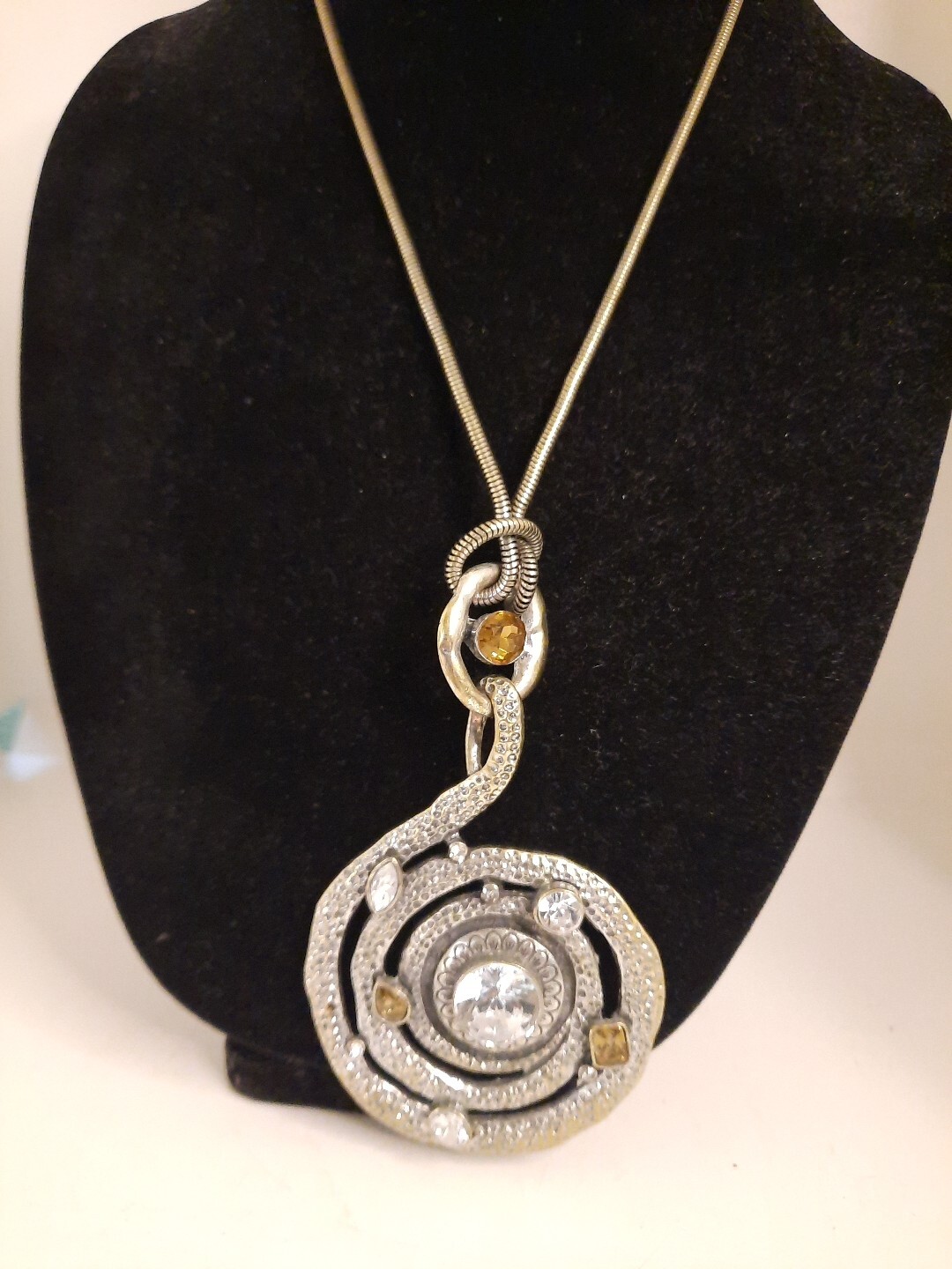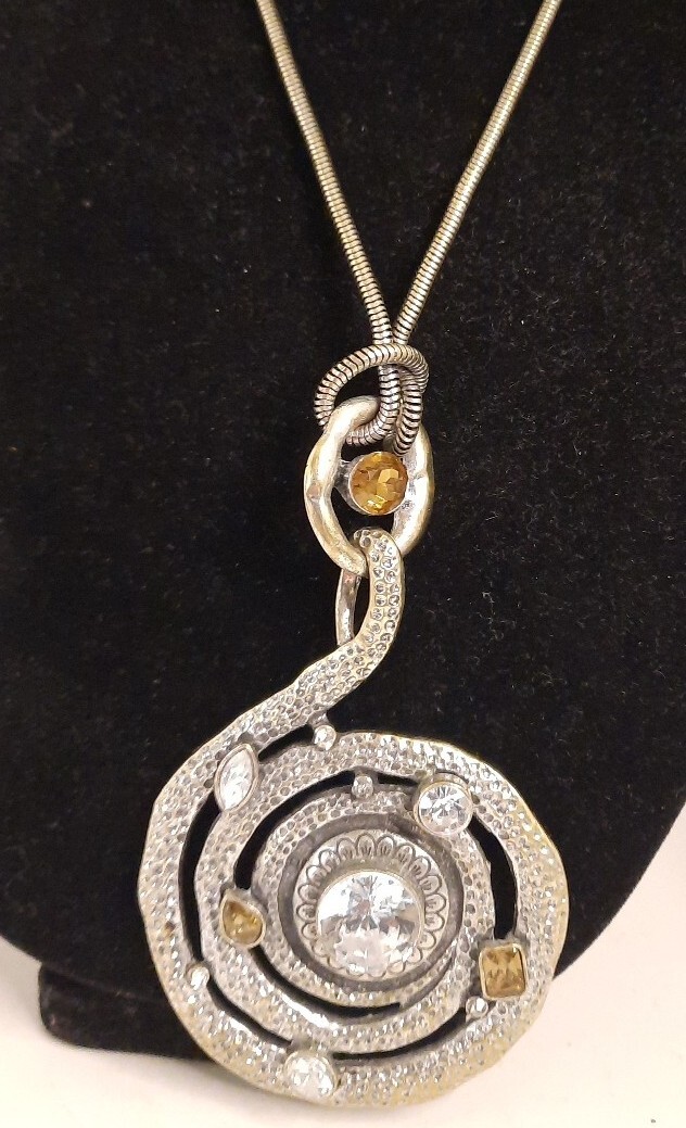 This vintage estate necklace features a chunky spiral cord with a lobster closure and a clear glass beaded chain. The pendant is an amulet style with a round citrine rhinestone and clear rhinestone accents. The necklace is 32 inches long and made of clear rhinestone and glass. The style is bold and beaded, perfect for adding bling to any outfit. The necklace has a beauty, art, and awareness theme and is a unique addition to any jewelry collection. Silver tone.