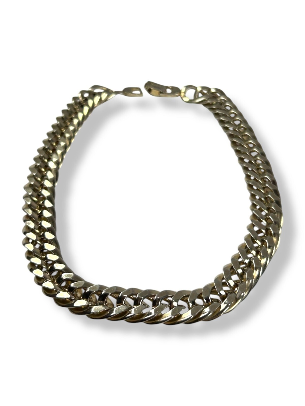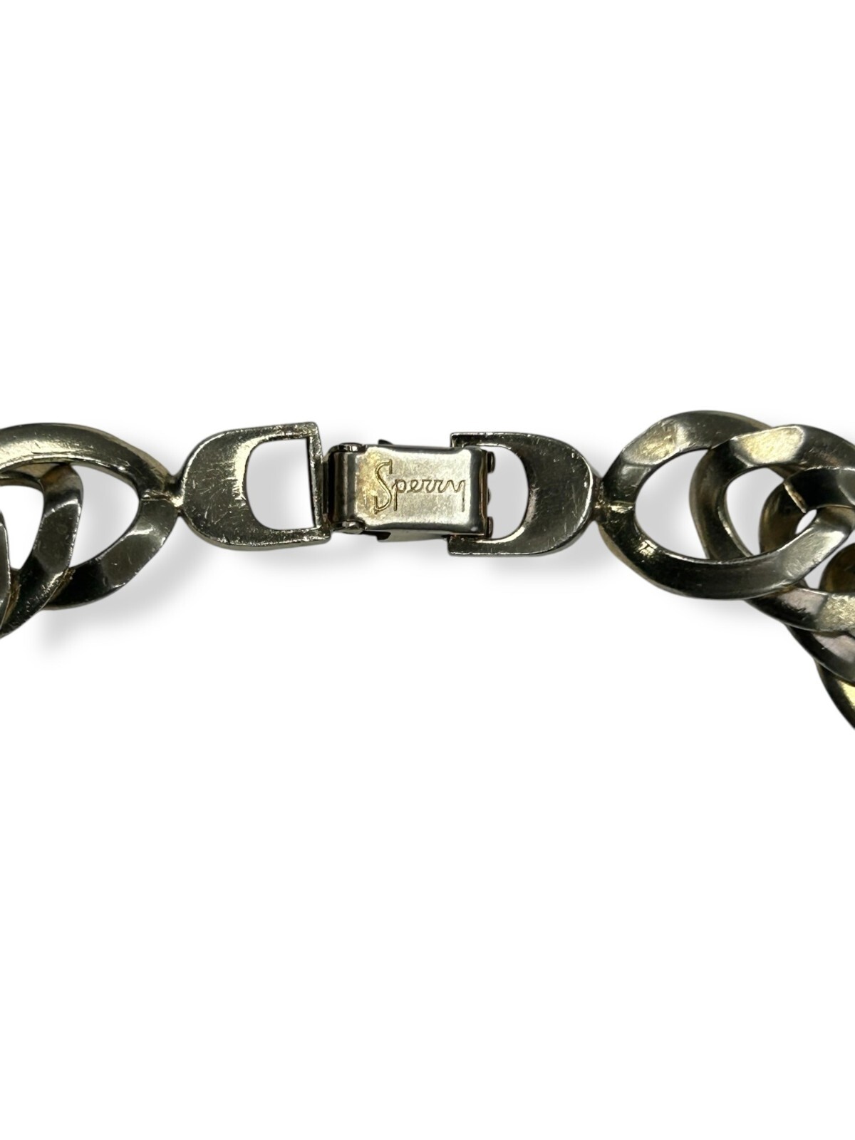 Pre-loved with minimal signs of wear, see photos for details Vintage Sperry Choker Chain Necklace Color appears to be white gold tone; Silvery-gold hue in the color Curb chainlink design Durable and dense quality metals Fold over clasp with engraved logo Fit sits slightly loose compared to a fitted choker necklace Closed/worn is 8" long Most likely made in USA #sperry #vintagesperry #sperrynecklace #chainlinknecklace #womensnecklace #chokernecklace #whitegoldtone #stainlesssteel #stainlesssteel #womensjewelry #curblinkchain #curblink