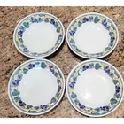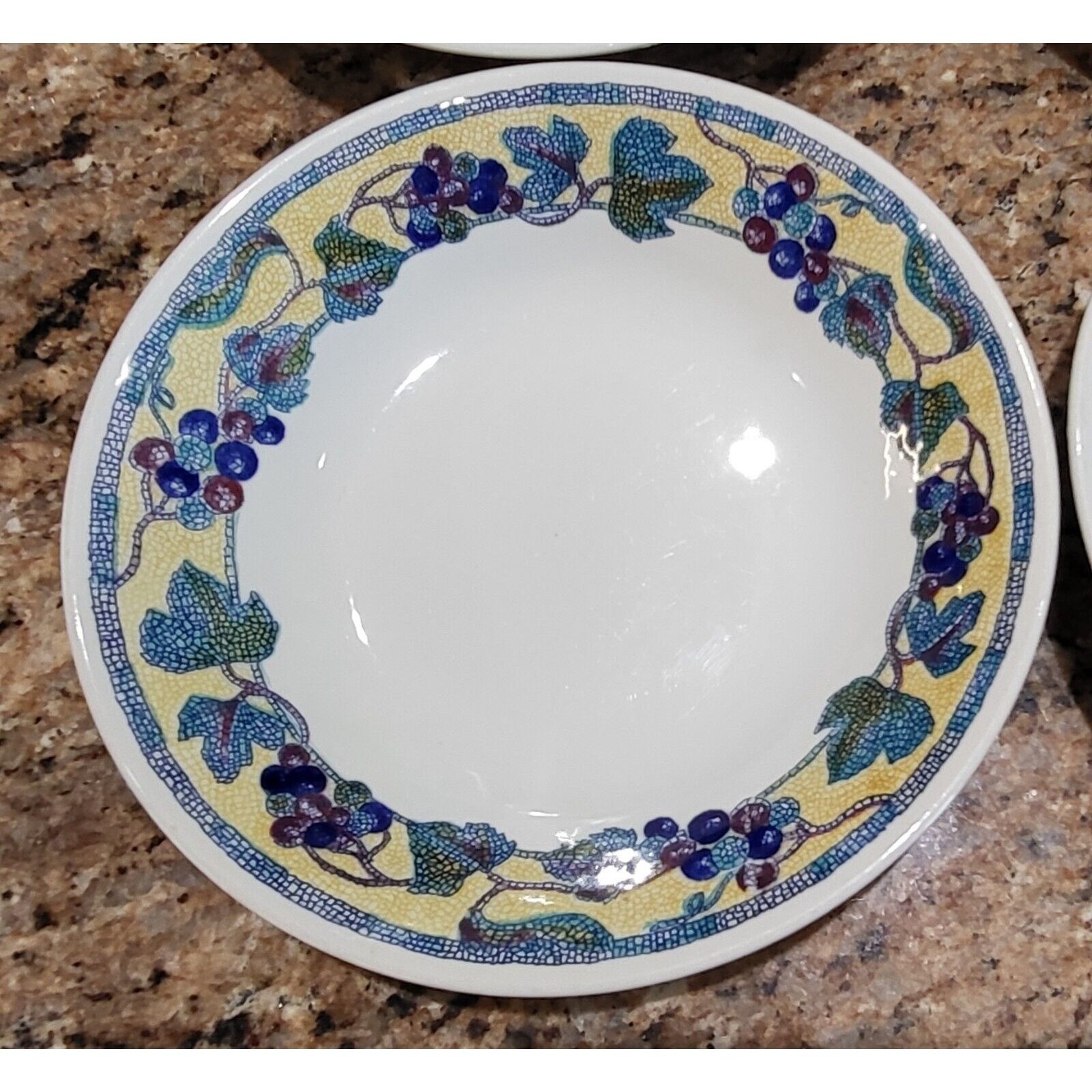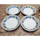 This beautiful soup bowl set of 4 from Churchill is perfect for all occasions. The round shape, multicolor grape & leaf mosaic with yellow rim makes it a great addition to any table setting. Each bowl has a diameter of 7 3/4" and a height of 1 5/8". Crafted from high-quality ceramic, these bowls are original and feature an impressed backstamp. The Georgian style with a glossy finish and decorative features adds elegance to any meal. Hand wash only with care instructions included. This four-piece set is a must-have for any collector or lover of fine tableware. * Width: 7 3/4 in * Crafted In England There are some noticeable imperfections and the set is priced accordingly. Please review all the pictures which show those details. There is a few blemishes like chips which are difficult to see.