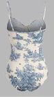 This Cider bodysuit features a Sweetheart neckline with a Toile De Jouy Blue Cream pattern. It has a Pullover closure and adjustable spaghetti straps. Made of a blended fabric of polyester and cotton, this tank style bodysuit is in size small (US size 6) with a regular fit. The strappy sleeve design is perfect for a casual occasion in any season.