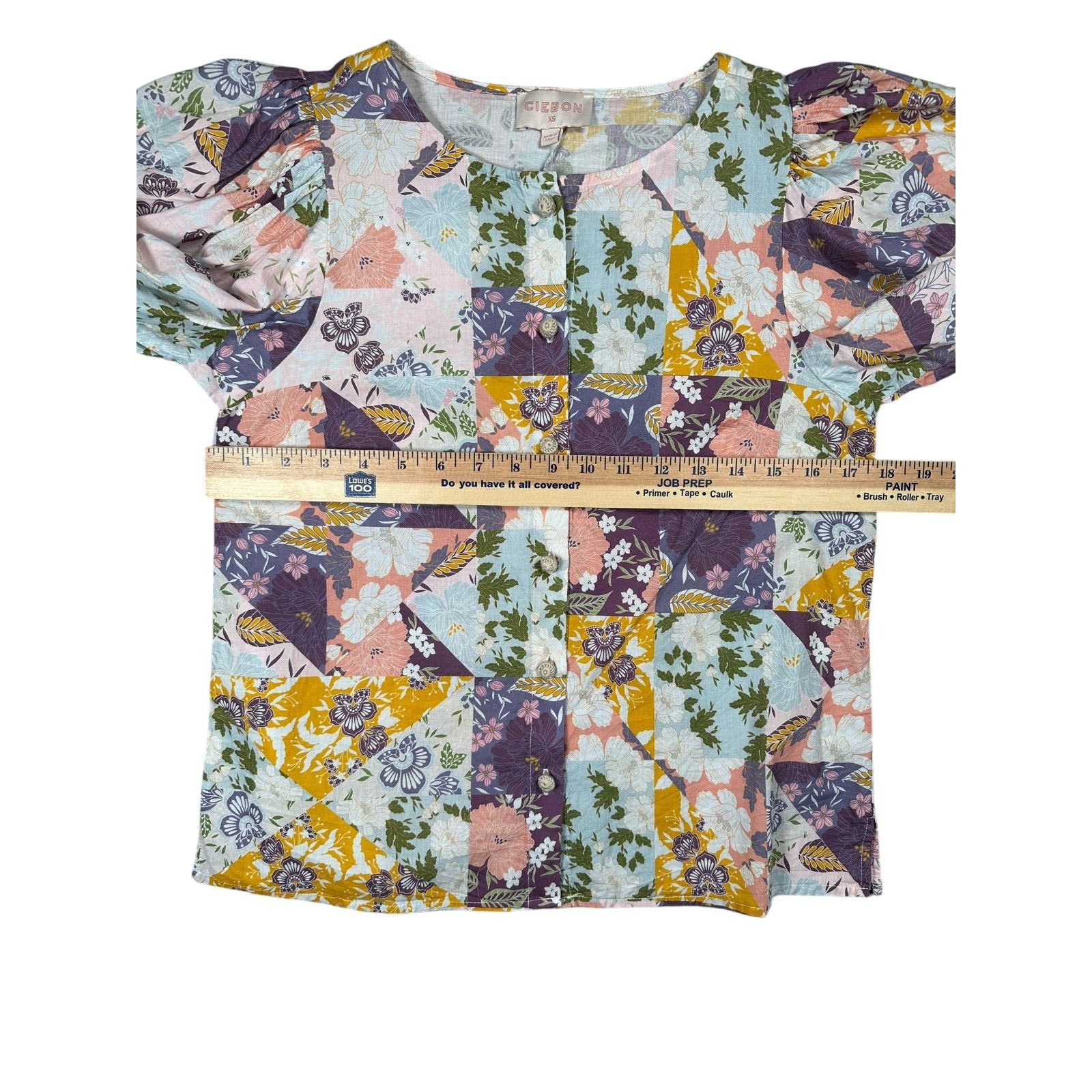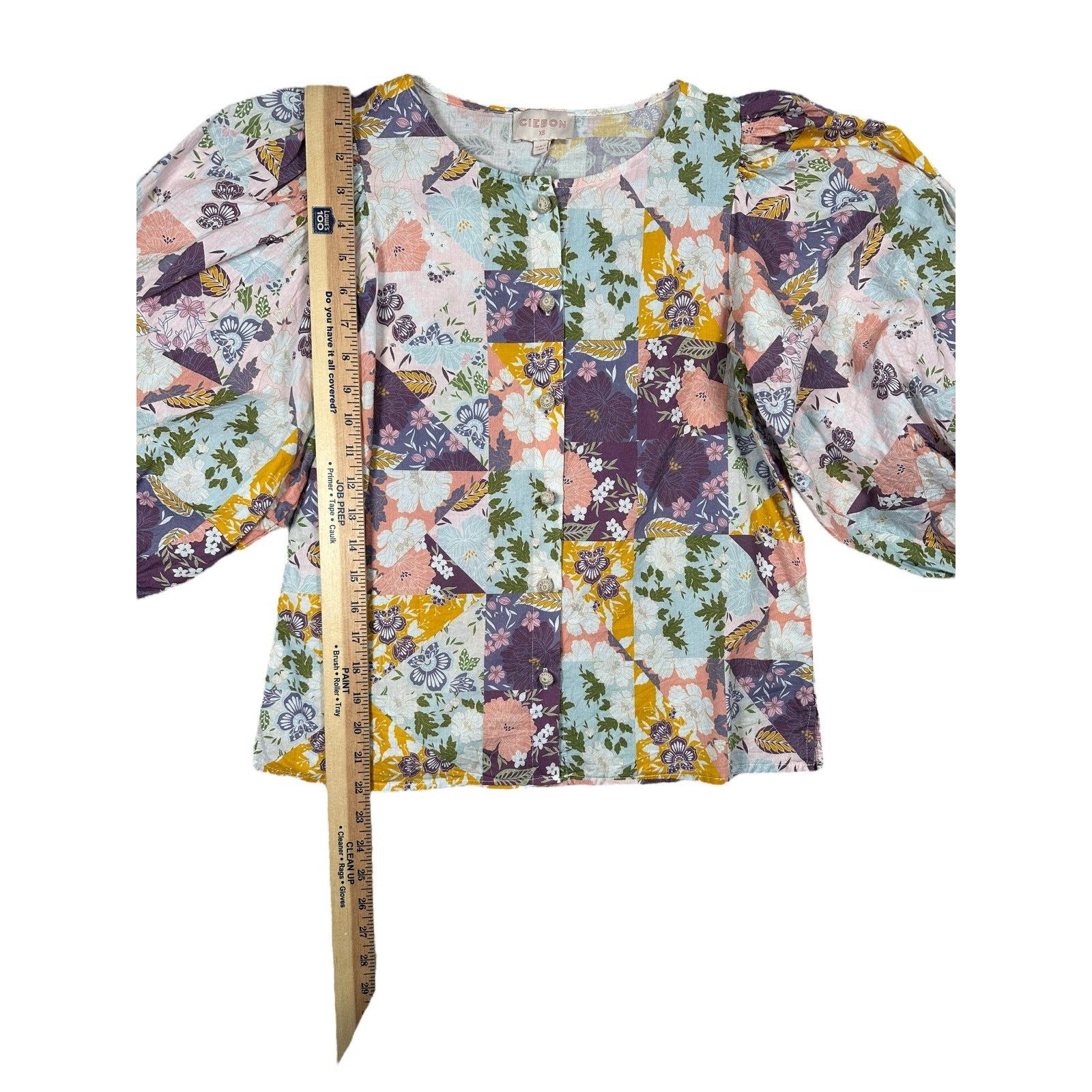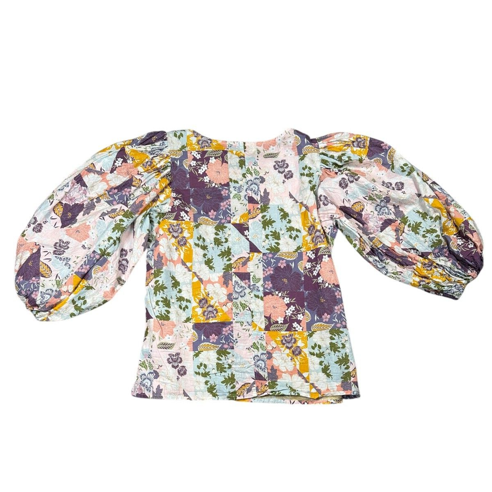 Ciebon Patchwork Puff Sleeve Pastel 3/4 Sleeve Blouse Size XS Button Front Cottagecore Great Preowned Condition Please refer to photos for size measurements / reach out with any questions or if you are wanting additional photos!