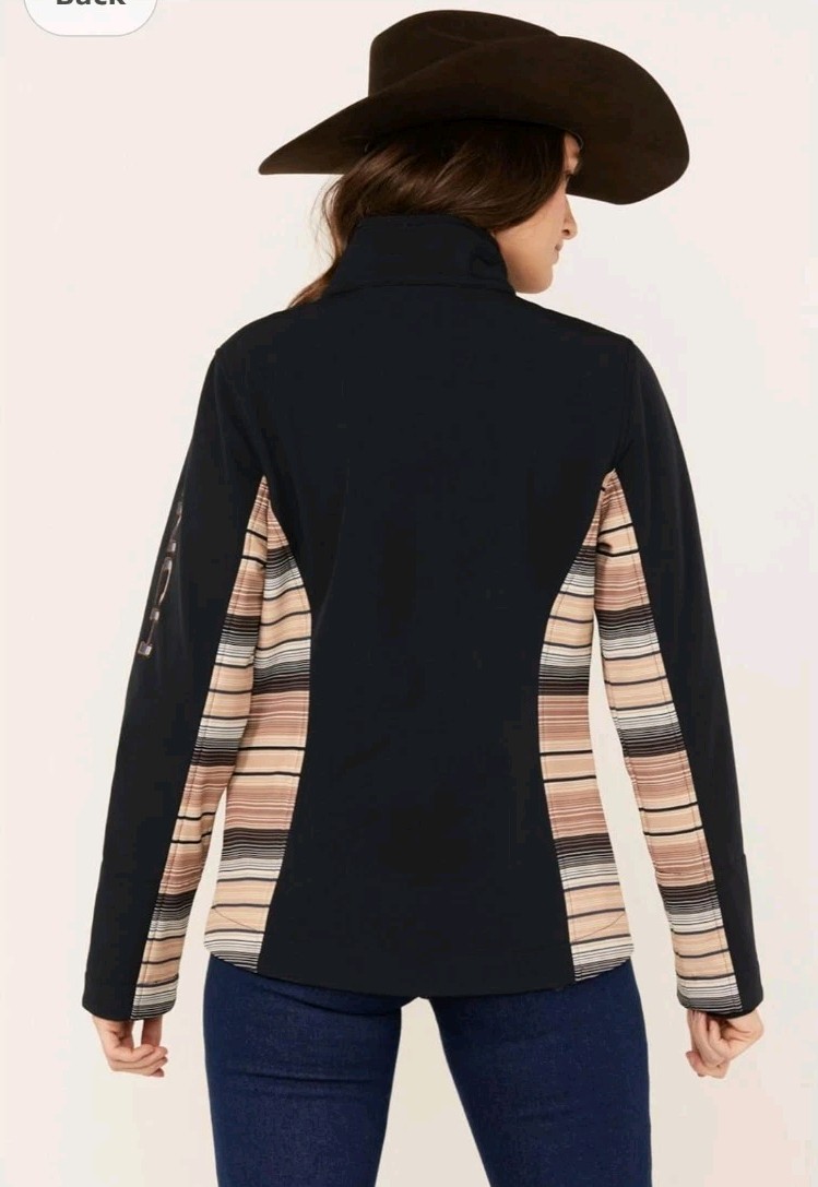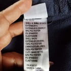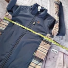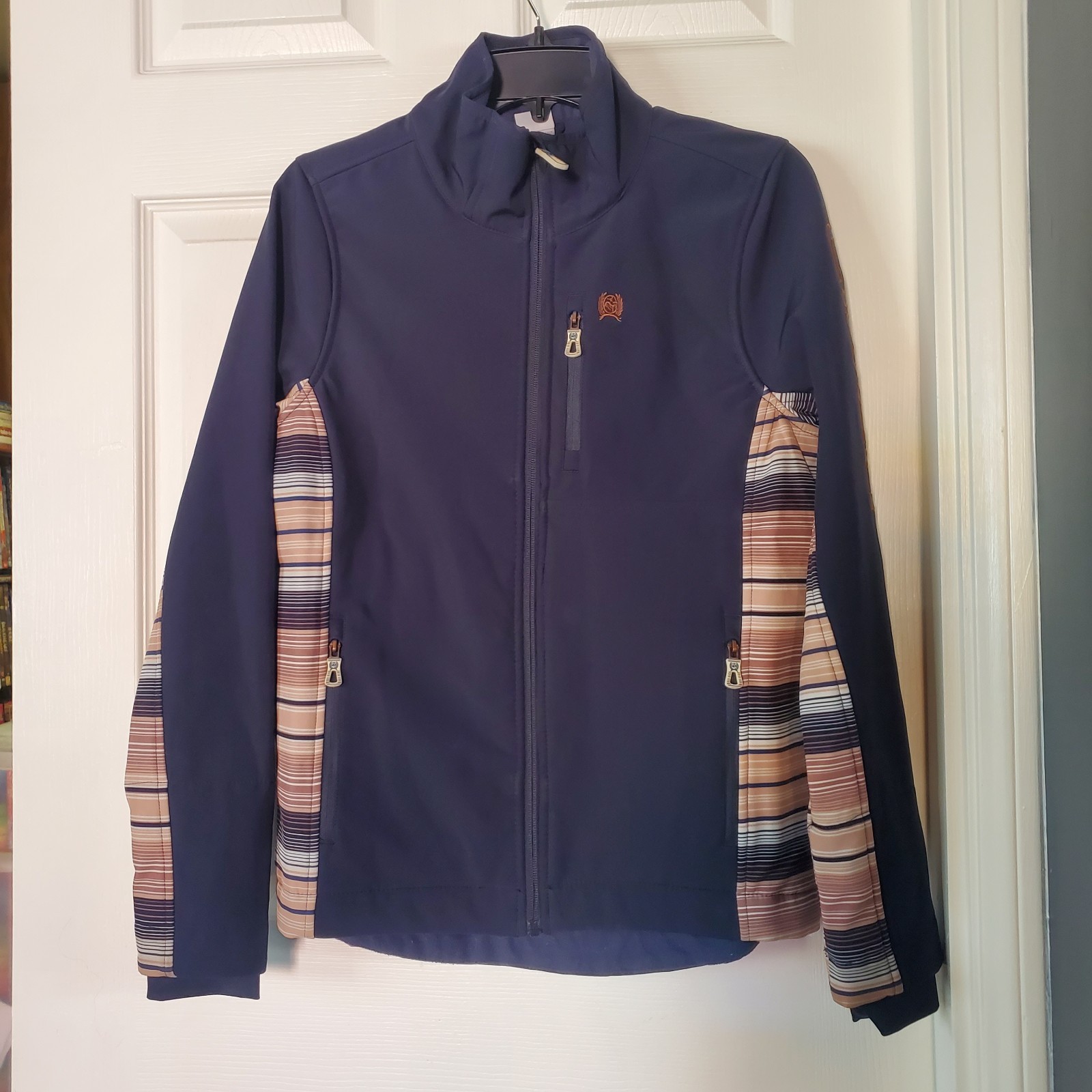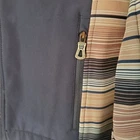 Stylish navy jacket featuring striped sleeves in beige and blue tones. Stand Up Collar Long Sleeves Full Front Zip Closure Two Welt Hand Warmer Pockets And Single Left Chest Pocket With Zip Closures. It's in like-new condition. Please see pictures for details and let me know if you have any questions I ship the next business day