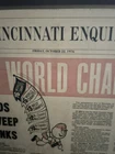 Cincinnati Reds Vintage Sports Memorabilia Laminated And Mounted Enquirer 1976. Professionally laminated and mounted by American Laminating Company Cincinnati is a page from the Sports section of The Cincinnati Enquirer dated Friday, October 22, 1976 Price 15 c titled “Still World Champs!” Reds sweep Yanks. This is in good condition considering age with yellowing and some holes in the paper at the bottom and not on the wording itself from a previous wall hang before mounting. Please see pictures. This would make a great gift for a sports enthusiast, collector, man cave, bar the list goes on and on. Overall measurement 17” x 28”.
