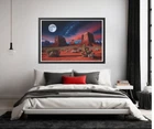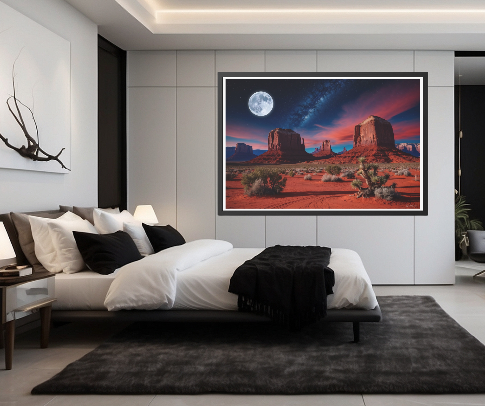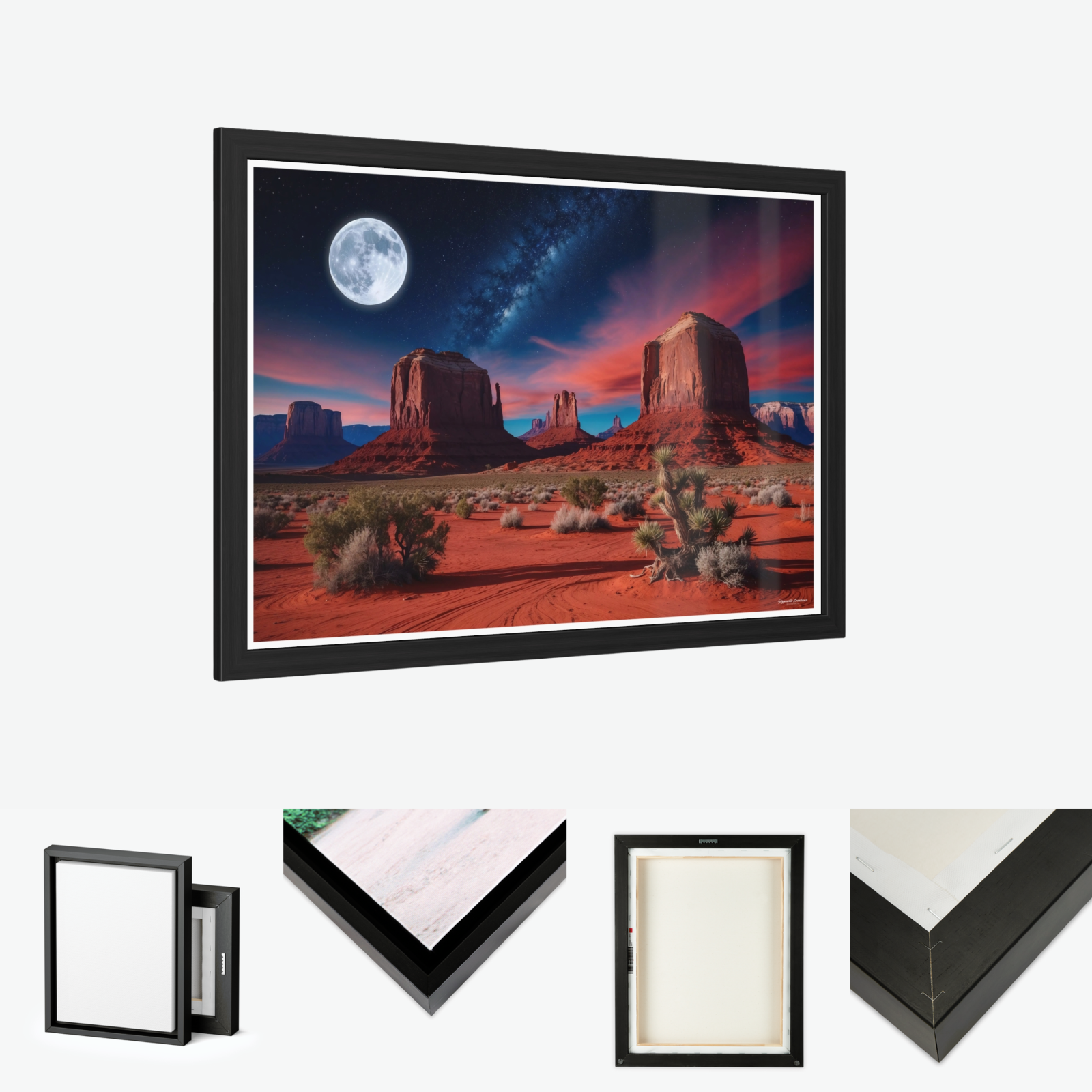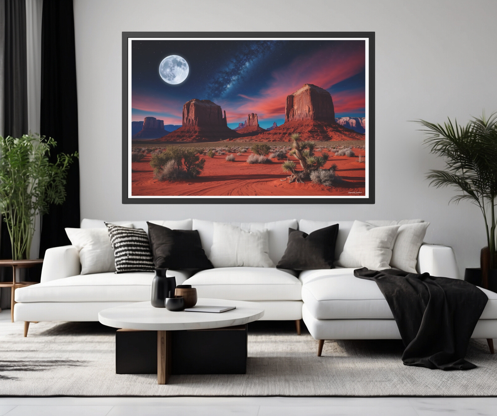 Cinematic Utah Red Desert Landscape Illustration by Hypnotik Creations Detailed Product Description: Immerse yourself in the cinematic splendor of the Utah Red Desert Landscape by Hypnotik Creations. This stunning illustration captures the raw beauty of nature at sunset, showcasing the vivid contrast between the crimson mountain plateaus and the sandy desert floor. A massive, luminous full moon dominates the sky, accompanied by the Milky Way galaxy and a dazzling array of stars, creating a breathtaking celestial backdrop. Expertly printed in HDR on premium 200 gsm semi-gloss coated paper , the artwork employs Mimaki UV inks and state-of-the-art printing techniques to ensure vivid, fade-resistant colors and impeccable detail. The piece is wrapped in a handcrafted wooden frame with a durable, scratch, and shatterproof Perspex insert for protection. A thin white outline complements the artwork, making it a versatile addition to walls of any color. For greater flexibility, an unframed print option is available in two out of three sizes. Proudly crafted in the UK from eco-friendly materials sourced globally. Key Features: Epic Desert Scene: Captures the Utah red desert at sunset with striking red plateaus, a sandy desert floor, and celestial elements like a massive full moon and the Milky Way galaxy. High-Definition Print: HDR printing on 200 gsm semi-gloss coated paper for vibrant, lifelike colors and sharp details. State-of-the-Art Printing: Mimaki UV inks provide fade-resistant, long-lasting quality. Handcrafted Wooden Frame: Features a scratch and shatterproof Perspex cover for durability and protection. Eco-Friendly Materials: Made in the UK using sustainable, globally sourced components. Customizable Display Options: Thin white outline enhances display versatility. Size Options: Framed-30x20, 36x24 & 48x32, Unframed-30x30 & 36x24. Bring the awe-inspiring beauty of Utah’s red desert to your home with this cinematic masterpiece, perfect for elevating any space with its bold, natural elegance. * Shipping to Alaska, Hawaii, and unincorporated territories of the United States can take additional 7 ? 12 business days, weather permitting.