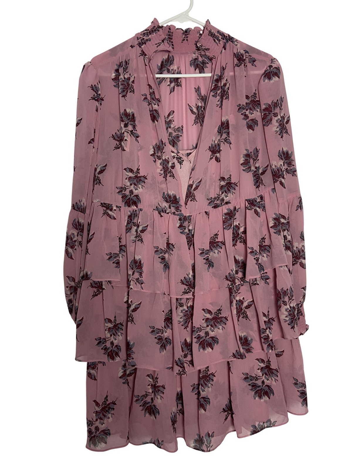 The Cinq À Sept tiered ruffle dress features a sophisticated floral print in pink sand multi, ideal for a polished and refined look. The elegant design and quality craftsmanship make it a desirable addition to any wardrobe. • Tiered ruffle design • Long sleeves with elastic cuffs • High neckline • Lightweight and airy fabric • Original tags attached