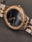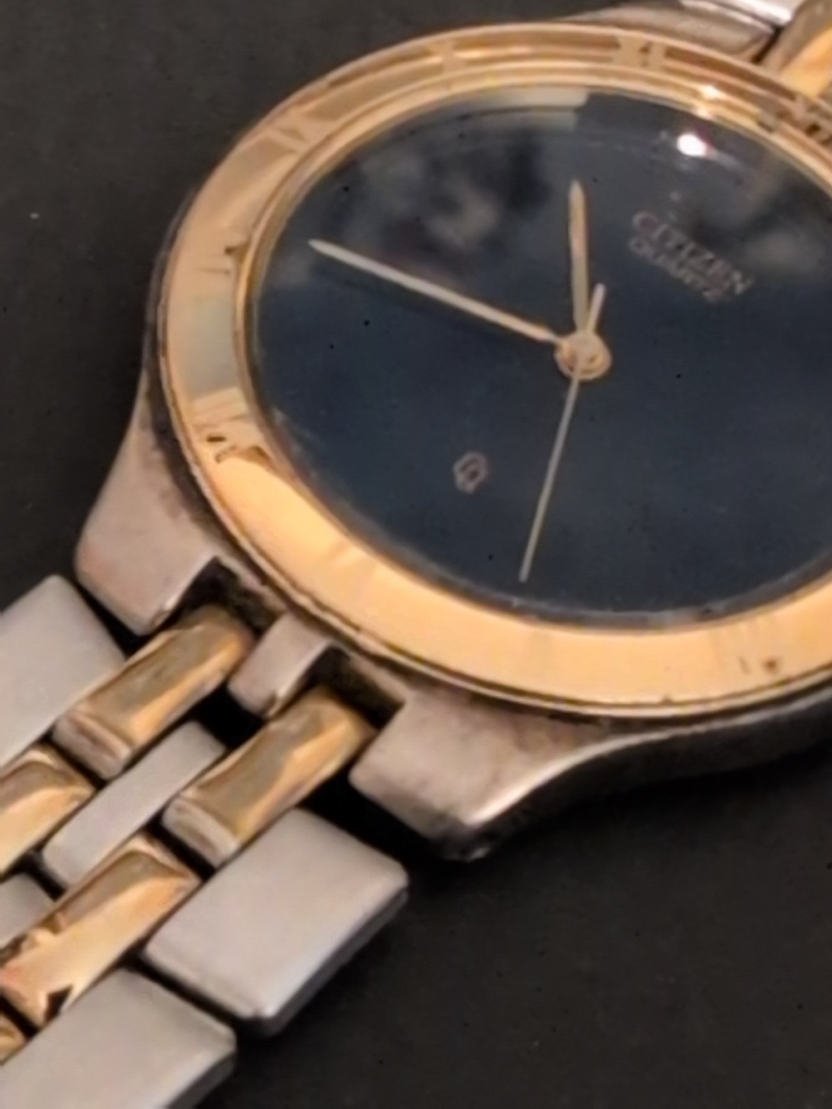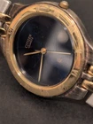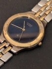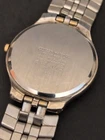 The Citizen CQ Quartz Watch for Men is a vintage timepiece with a classic black dial and silver gold accents, featuring Roman numerals as indices. This round watch has a 32mm gold case with a white dial, and is water-resistant with a 12-hour dial. Crafted in Japan, it comes with a stainless steel bracelet band and a snap caseback, making it perfect for dress/formal occasions or casual wear. Untested, most likely needs a new battery. No box, no manual, purchase as is.