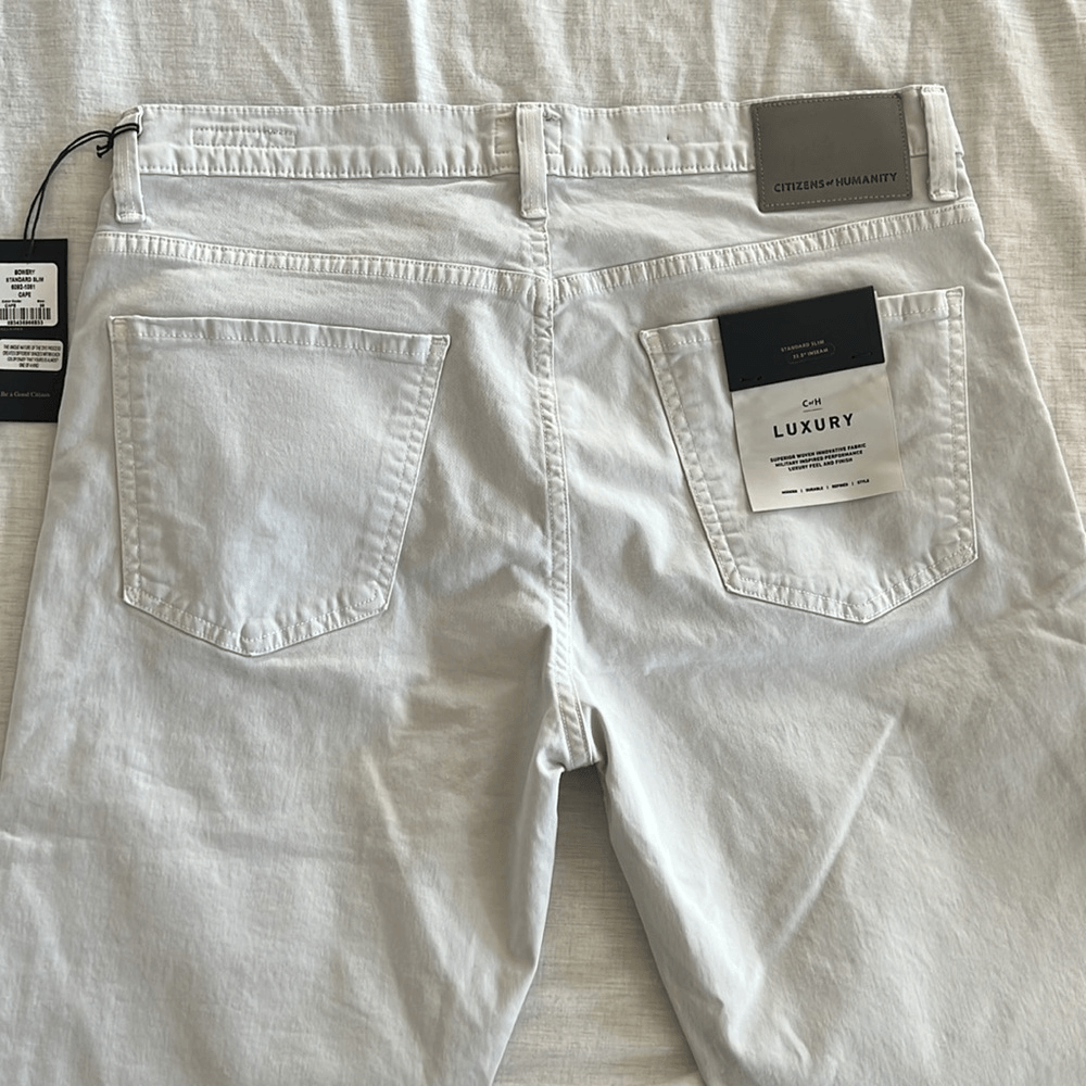 Citizen for Humanity Bowery Luxury Standard Slim Pants Denim NEW WITH TAGS - a tiny pin hole near bottom - see 3rd to last photo Color: Ivory / Sand (official color cape) Size: 36 x 32
