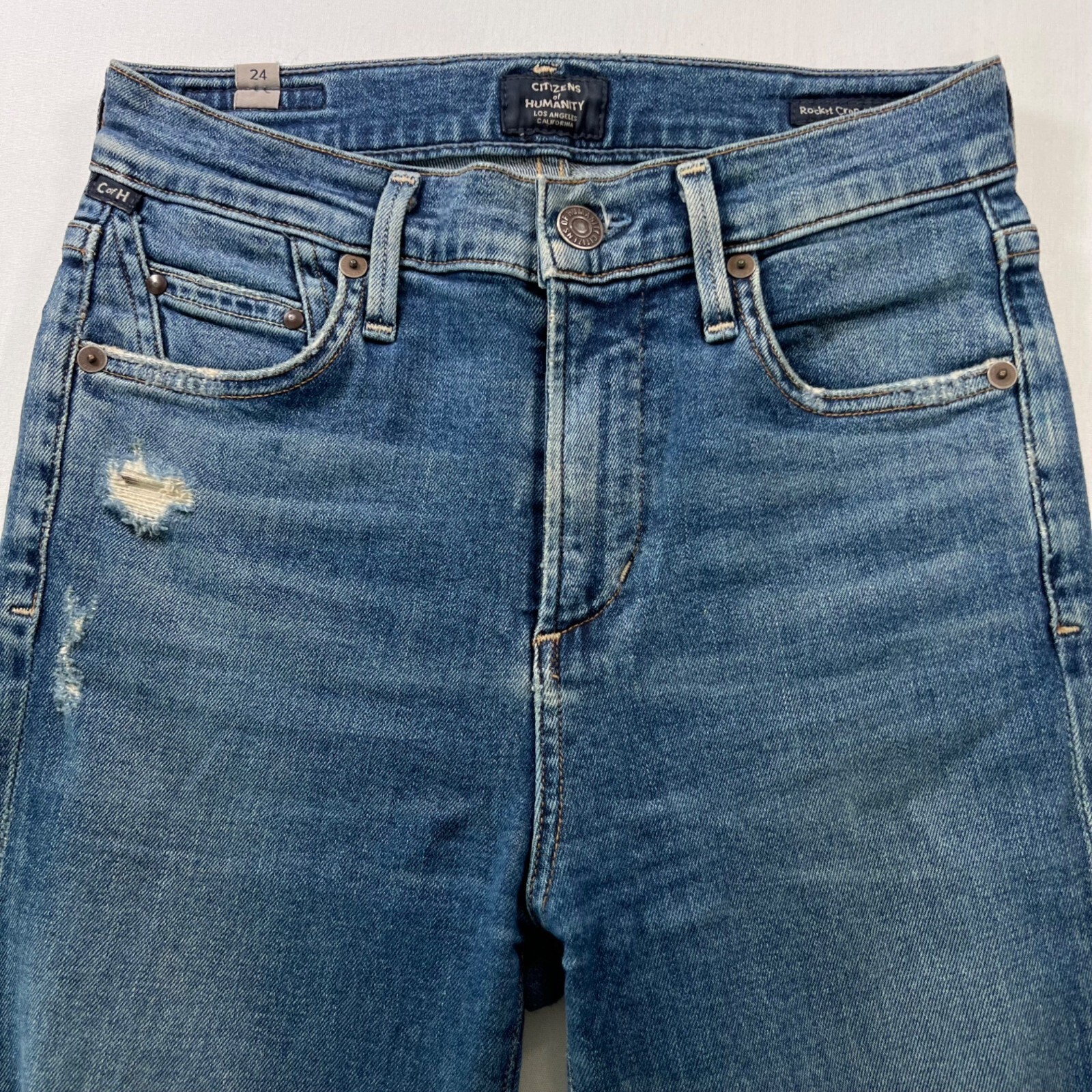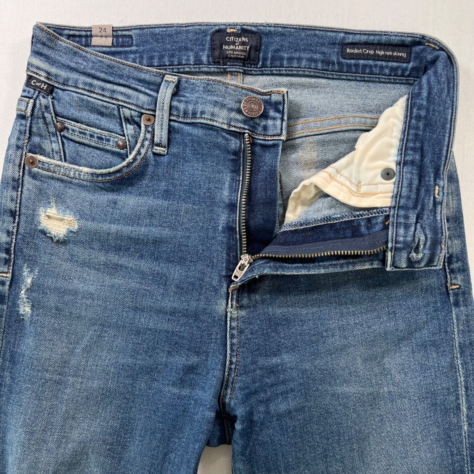 Brand: Citizens of Humanity Style: Rocket Crop High Rise Skinny Item Details: Skinny leg High rise Distressed / destroyed / torn knee Zipper Fly 5 Pockets Whiskering Stretch Condition: Excellent, pre-owned condition Wash/Color: Deja Vu Material: 98% Cotton 2% Spandex Marked Size: 24 **See measurements Measurements: Measurements are taken seam to seam when possible, with the item lying flat and not stretched. Items may not be true to size label (especially if it is denim or vintage), please refer to the actual measurements listed to assist you with fit. NOTE: Not all designers follow the US standardized sizing chart. Waist: 24” (12” flat across) Inseam: 25" Rise: 10” Terms of Sale Your purchase is very much appreciated. We want this to be an enjoyable experience for both you and us! We'd love for you to be a happy repeat customer! Thank you for your support of our small business. Payment: We can only ship to the address on file with eBay. For auction/best offer items, please pay within 2 days of auction's end. Buy It Now purchases require immediate payment. Returns Not Accepted: All sales final. We do our best to inspect our items thoroughly and to describe them accurately with measurements, pictures and details. Please refer to all and ask any questions prior to bidding/buying. We do not offer returns for items that don't fit or if you decide you no longer want it. That being said, we do stand behind everything we sell for accuracy of description. Item # 192K
