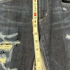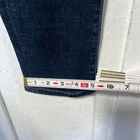 Manufacturing distressing Zipper fly with button closure Dark wash with whiskering Slim fit Good preloved condition no staining Smoke Free Dog Friendly Home Please be aware to expect a slight variation in color due to lighting and your device screen settings .