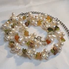Citrine, Jasper and Peridot Gemstones blended with Baroque Cultured Pearls. Exceptionally pretty vintage Necklace on sturdy catch which appears silver although the mark is hard to find. Long extra length chain allows for adjustment on length. Small silver/silver coloured beads between clusters of pearls and gemstones.