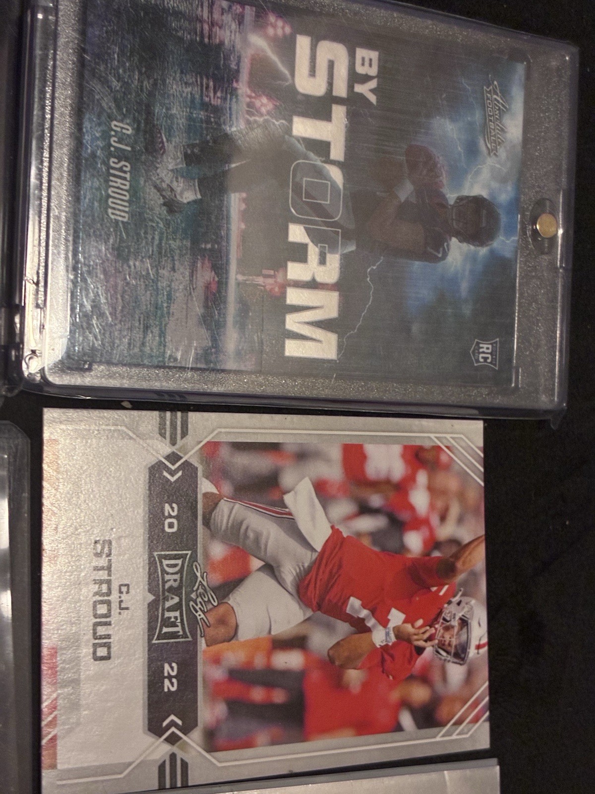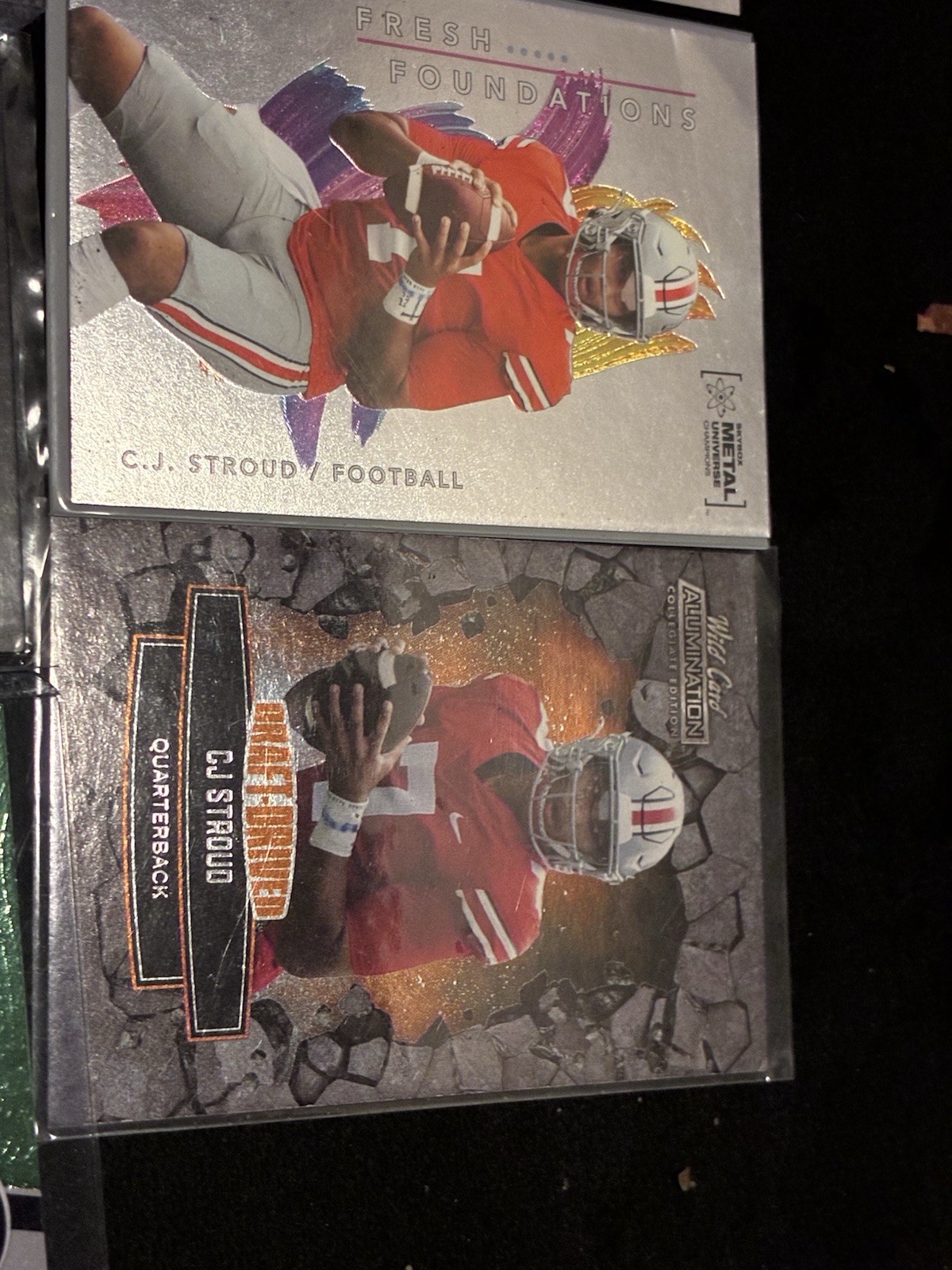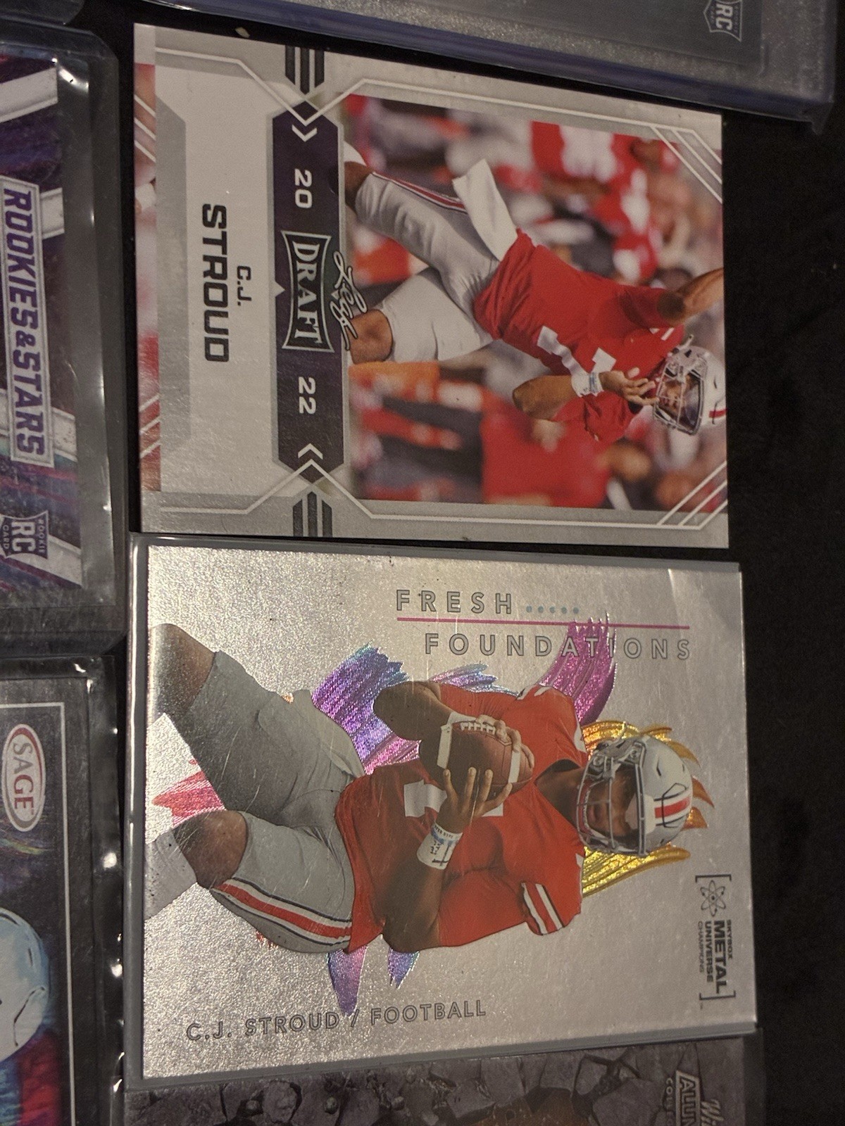 The C.J Stroud Rookie Card Lot features trading cards of the talented football player from his time with the Houston Texans and Ohio State Buckeyes. As a rookie card, it holds value for collectors and fans wanting to invest in the potential future success of this athlete in the National Football League (NFL). With cards showcasing Stroud's early career and development, this lot is a must-have for any football trading card enthusiast looking to add a promising rookie to their collection.