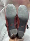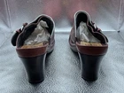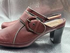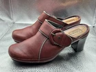 Step into comfort and style with these Clarks Artisan mules. Crafted from pebbled leather and featuring a buckled accent, these brown block heel mules are perfect for any occasion. The cushioned insole and synthetic lining ensure a comfortable fit, while the rubber outsole provides stability. With a round toe and mid-height block heel, these mules are perfect for travel, activewear, casual wear, and workwear. The slip-on style makes them easy to wear, and the solid pattern and Clarks Artisan buckle accent add a touch of sophistication. These mules are available in women's size 9.5 and UK size 7.5, with a shoe width of M.