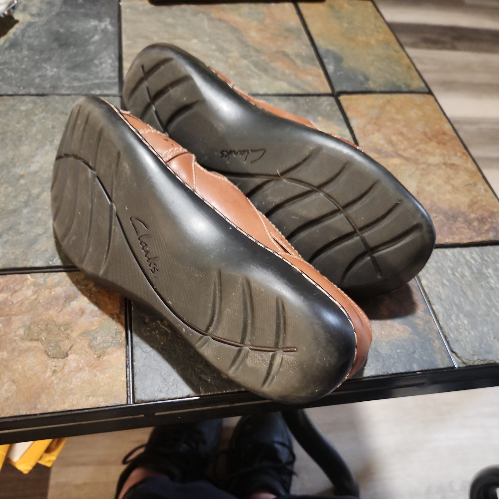 The Clarks Ashland Spin Q Slip-On Loafer is a comfortable and versatile women's shoe in size 8.5. This brown leather shoe features a round toe, hook & loop closure, and cross strap accents. Designed for various occasions such as travel, casual wear, and business meetings, it offers moderate cushioning with a foam insole and rubber outsole. This Mary Jane style shoe with a cute cut out pattern and Cottagecore theme is a classic addition to any wardrobe.