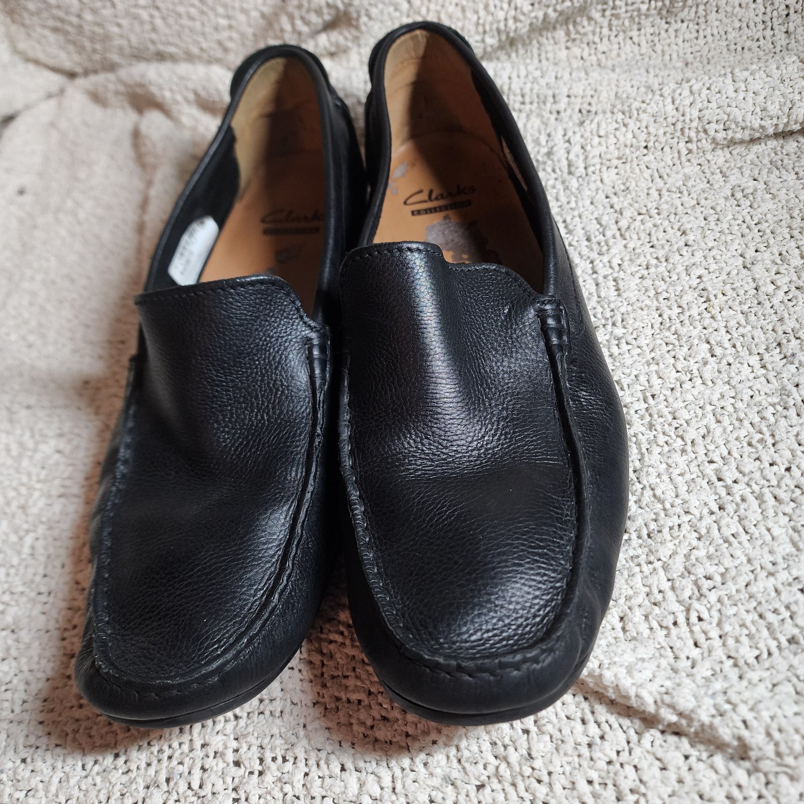 **See photos for condition and wear. There is some insole peeling due to using inserts, then removing them. Overall shoes are in very good condition. The Clarks Black Leather Markman Plain Driving Loafer in Men's US Size 11 features a simple yet stylish design, perfect for various occasions such as travel, casual outings, and workwear. Crafted from high-quality leather with a cushioned and lightweight outsole, these loafers provide comfort and support for all-day wear. The black color, round toe shape, and slip-on closure make them versatile for summer, fall, and spring seasons. With the Clarks logo accent and extreme comfort features, these loafers are a practical and fashionable choice for the modern man.