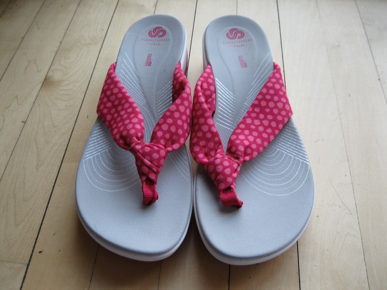 Clarks Cloudsteppers Arla Glison Cushion Thong Sandal Rose Red Women 12 NEW Retails: $65 Website Description: A sporty, oh-so-comfortable Cloudsteppers™ sandal we love, toe post flip-flop Arla Glison's classic curved silhouette. Underfoot, its cushioning and airy sole are ideal for featherlight summer wear – and a machine washable finish keeps this style looking tip-top all season long. Soft fabric upper Machine washable for easy care Cushion Soft™ footbed offers lasting comfort Lightweight EVA midsole absorbs shock Heel height: 40mm Gentle reminer, please c ontact me if there is ever an issue . If I don't know there is a problem, I can't fix it.