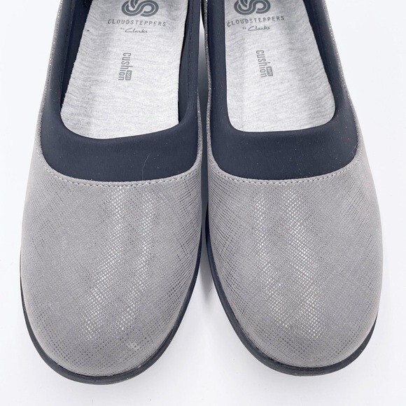 Cloudsteppers by Clarks Womens Ayla Pure Closed Toe Loafers Flats Grey with black Slip on styling Soft Cushion comfort insoles Comfort shoes Size 6.5 Excellent pre-owned condition
