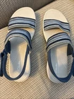 These Clark's Cloudsteppers sandals are a great addition to any woman's shoe collection. The blue color and slip-on style make them perfect for everyday wear. The synthetic upper material and hook & loop closure provide a comfortable and secure fit. These sandals are a UK size 5.5, US size 8, and EU size 39. They are in excellent used condition and are a great value for any woman looking for a stylish and comfortable sandal.